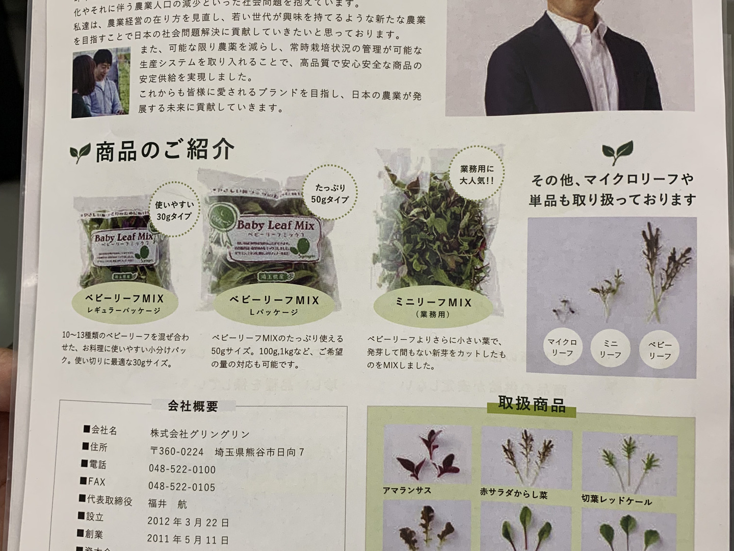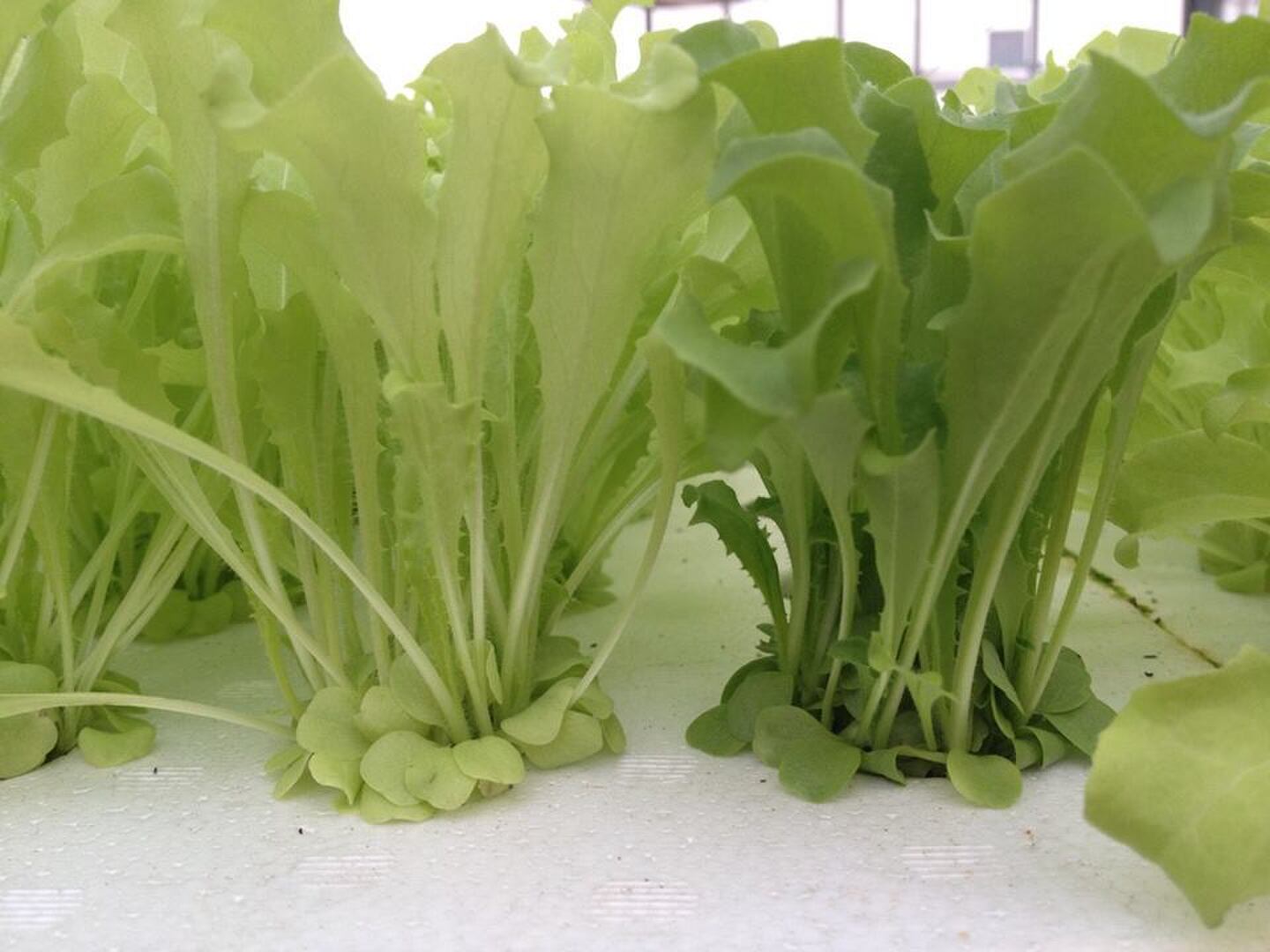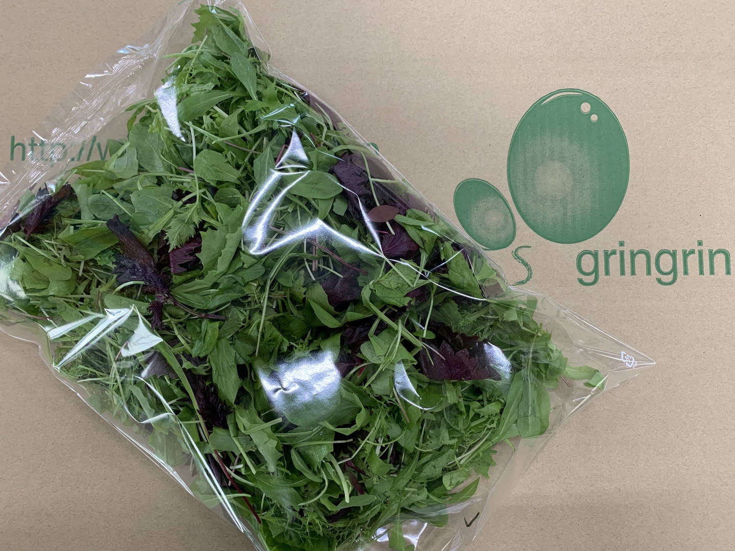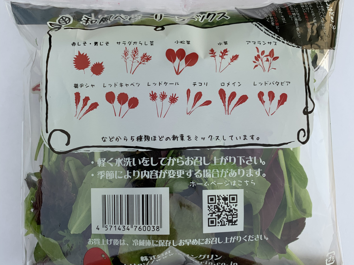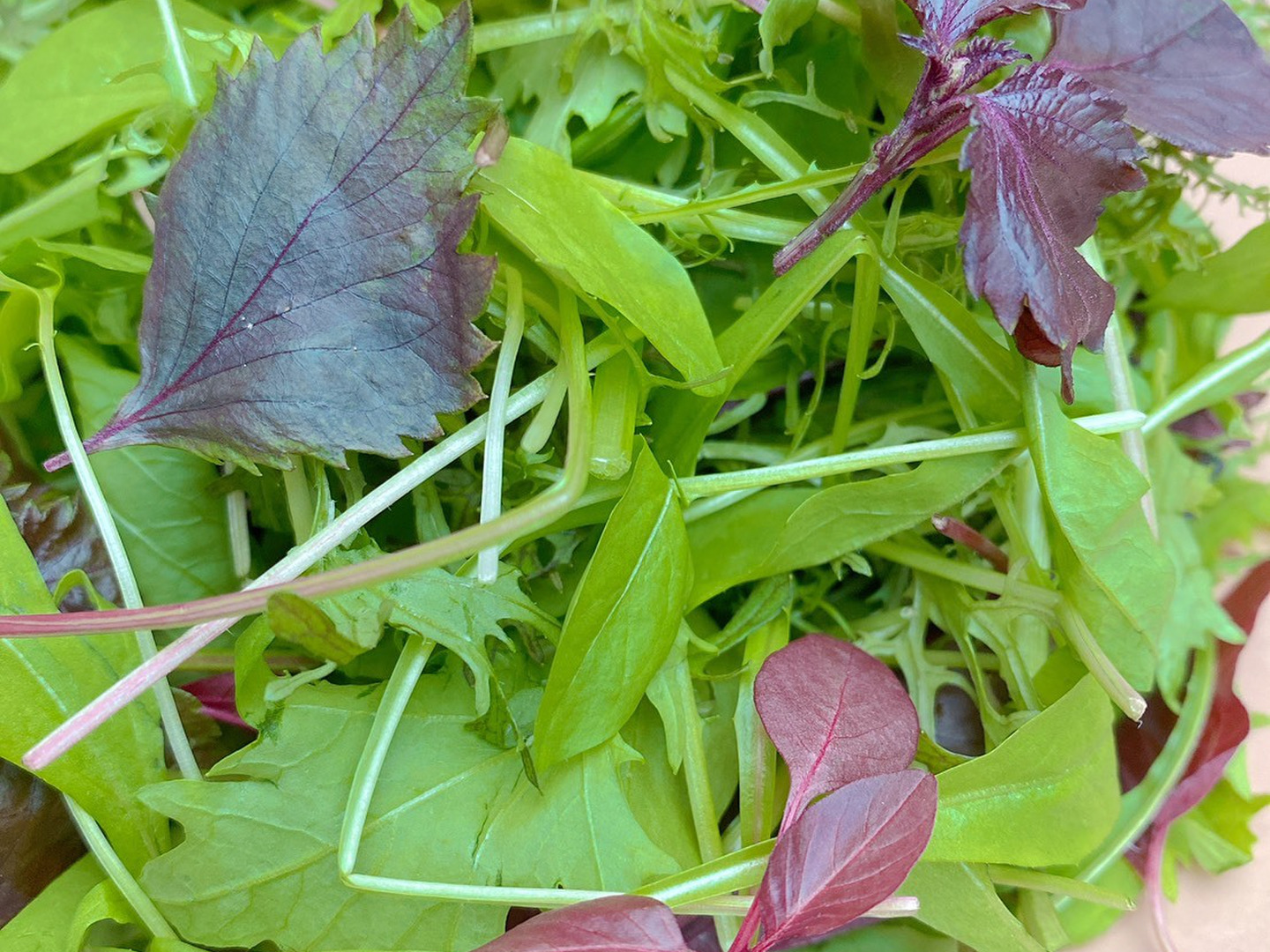 赤しそ、青しそ、サラダからし菜、小松菜、水菜、アマランサス、菊ヂシャ、レッドキャベツ、レッドケール、チコリ、ロメイン、レッドバタビアなどから、5種類程の新葉をミックスしています。