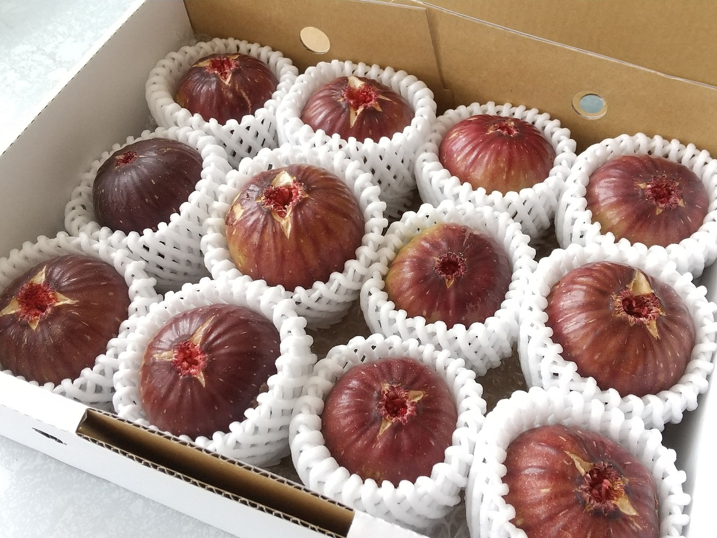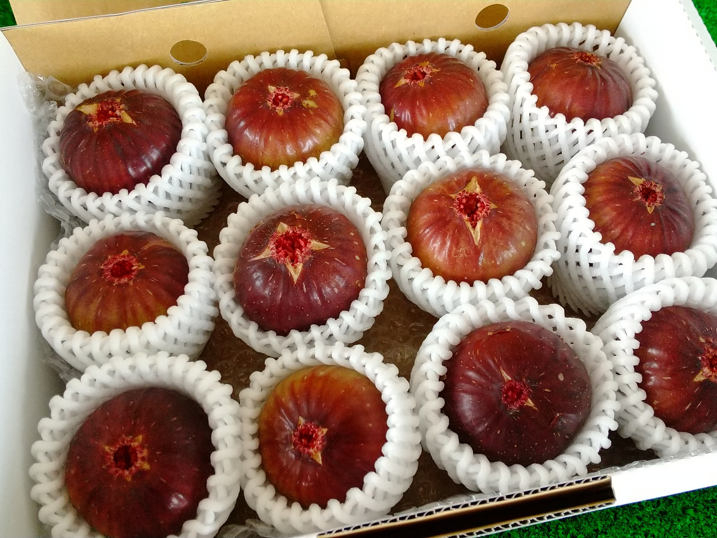 朝採りで収穫したいちじくを12個、専用の箱とクッションに詰めて発送いたします。