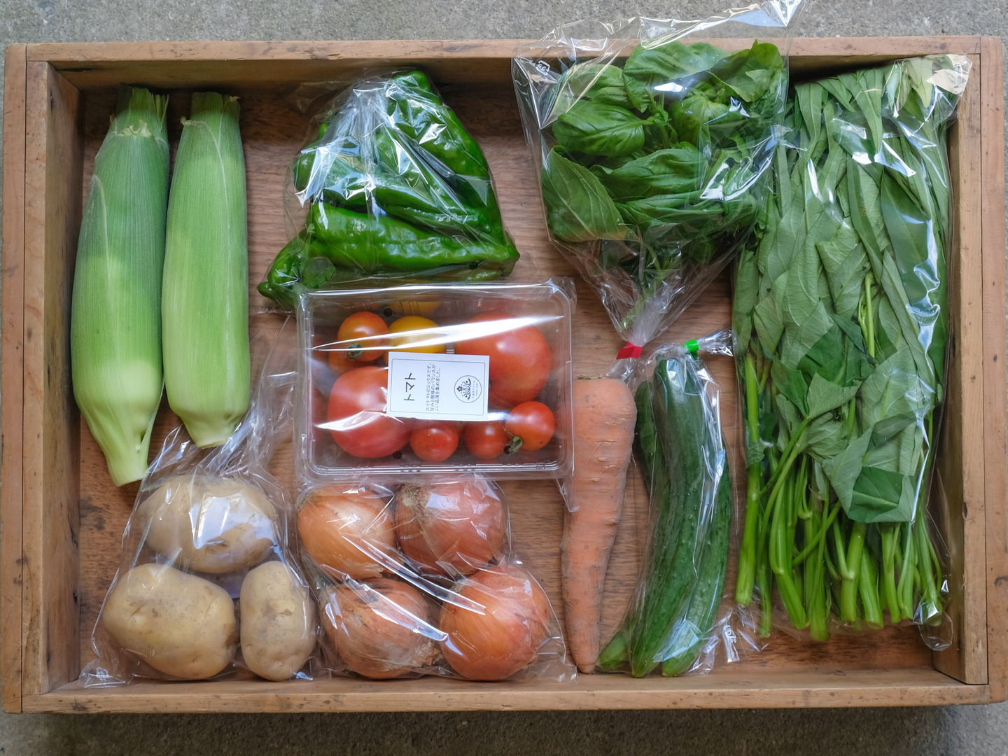 ジャガイモ、玉ねぎ、赤玉ねぎ、夏の葉物(モロヘイヤ、空芯菜、ツルムラサキのいずれか)、ナス、トマト、キュウリ or ゴーヤ、ピーマン、オクラ、カボチャ、ニンニク、ゴボウ