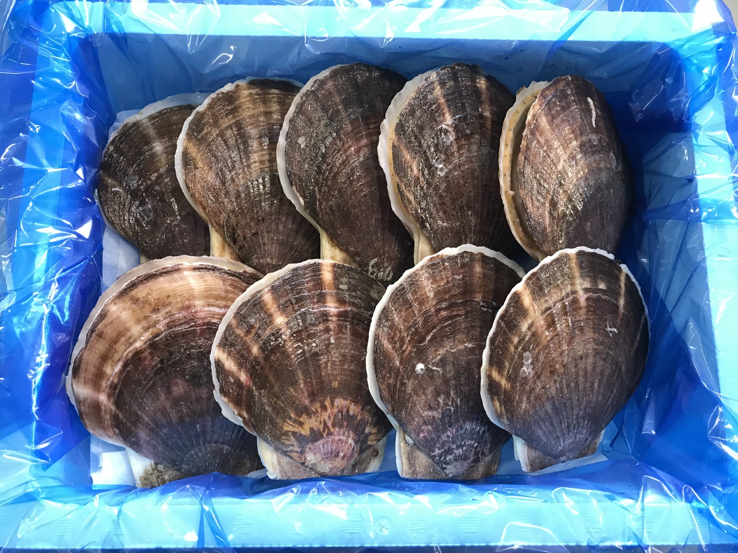 【中】荒海ホタテ(殻付・活)2kg(9枚入)/1ケース /専用ヘラ、軍手付