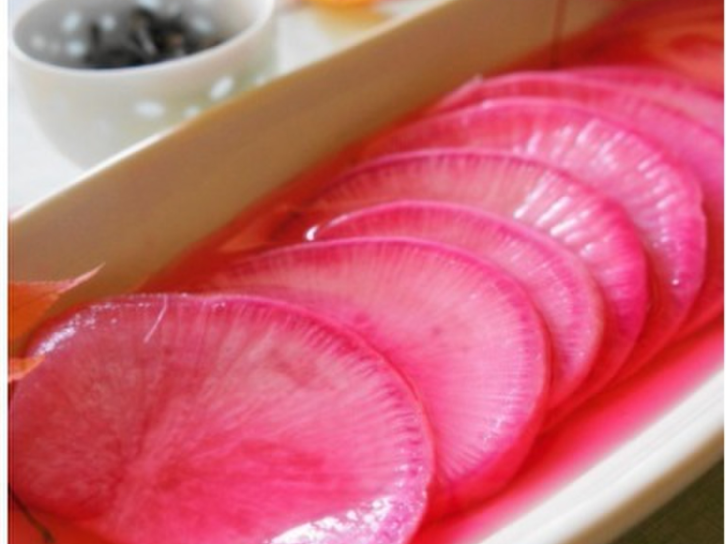 私の、感想ですが、酢漬けにすると、ほんのり、赤くなります。普通の、いわゆる白大根と違った色合いになり、なますとかにして食べると美味しかったです。