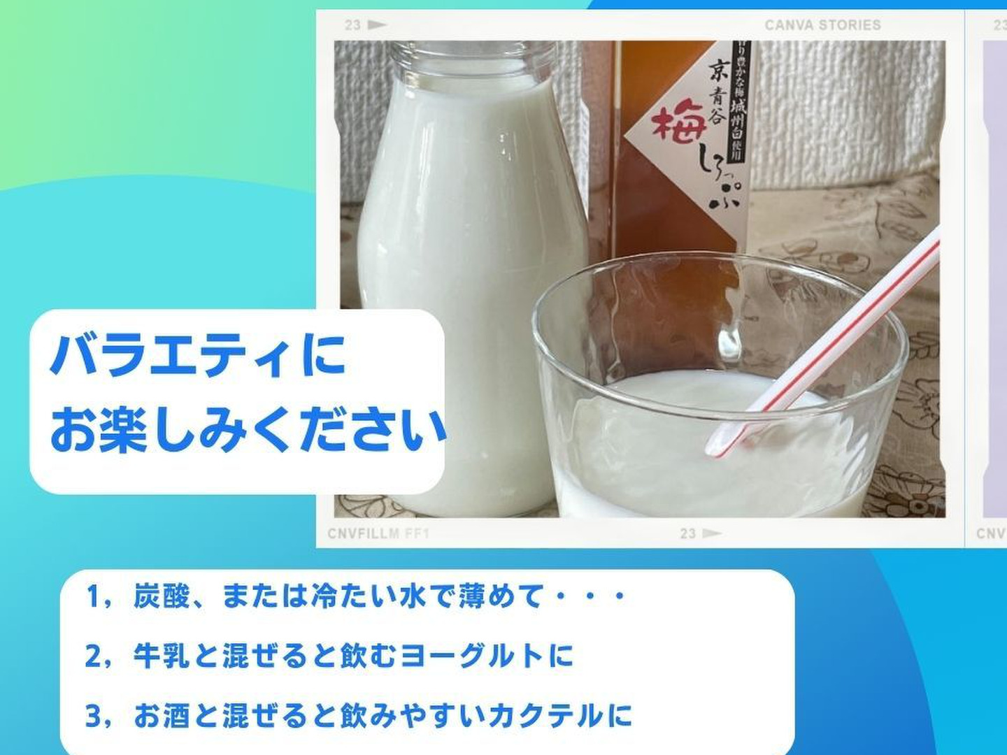 炭酸で割ったり、お酒に加えてカクテルにしてもおいしく飲めます。
