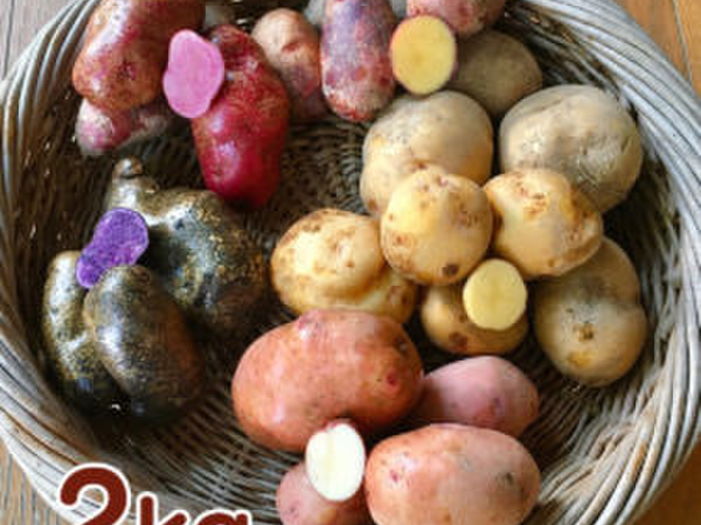 セット内容 ジャガイモの種類は以下の中より5種類の詰め合わせ(2kg)となります。 •シャドークイーン •ノーザンルビー •デストロイヤー •紅あかり •ゴールドメークイン •アンデスレッド •男爵 •北あかり ※じゃがいもの種類や大きさは写真とは異なる場合もございますので、予めご了承下さいませ。
