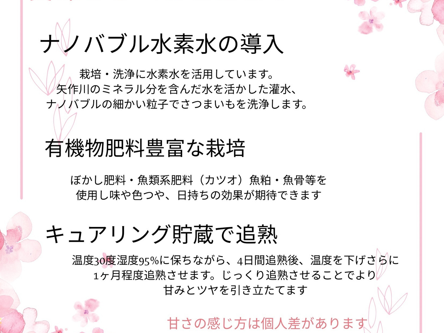 ※甘さの感じ方には個人差があります。蜜は出ませんが、ホクホクとした食感と優しい甘さが特徴です。