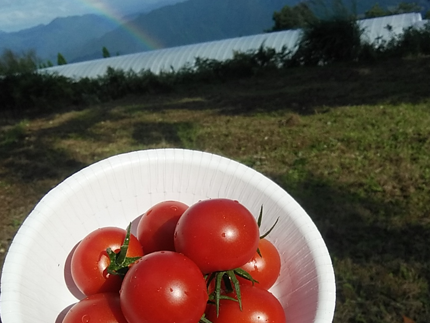 中玉サイズで瑞々しい真っ赤な山のトマトです。朝晩は気温が下がり寒暖差のある気候でつくるトマトは地元の産直でとっても甘いと大人気!トマト嫌いなお子様でも甘くて美味しいと食べていただいてます!
