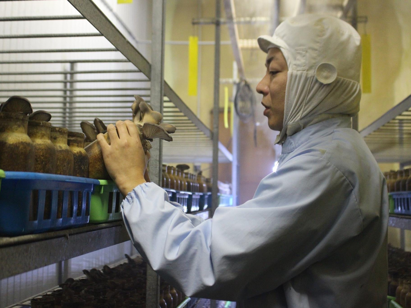 室内で育った黒あわび茸は1本1本、手作業で丁寧に収穫。