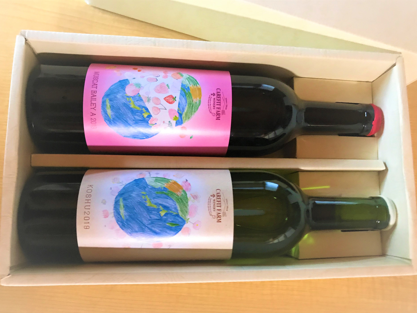 贈答用箱入り勝沼産の2019年に収穫したマスカットベーリーAと甲州で醸造した赤白1本ずつのセット