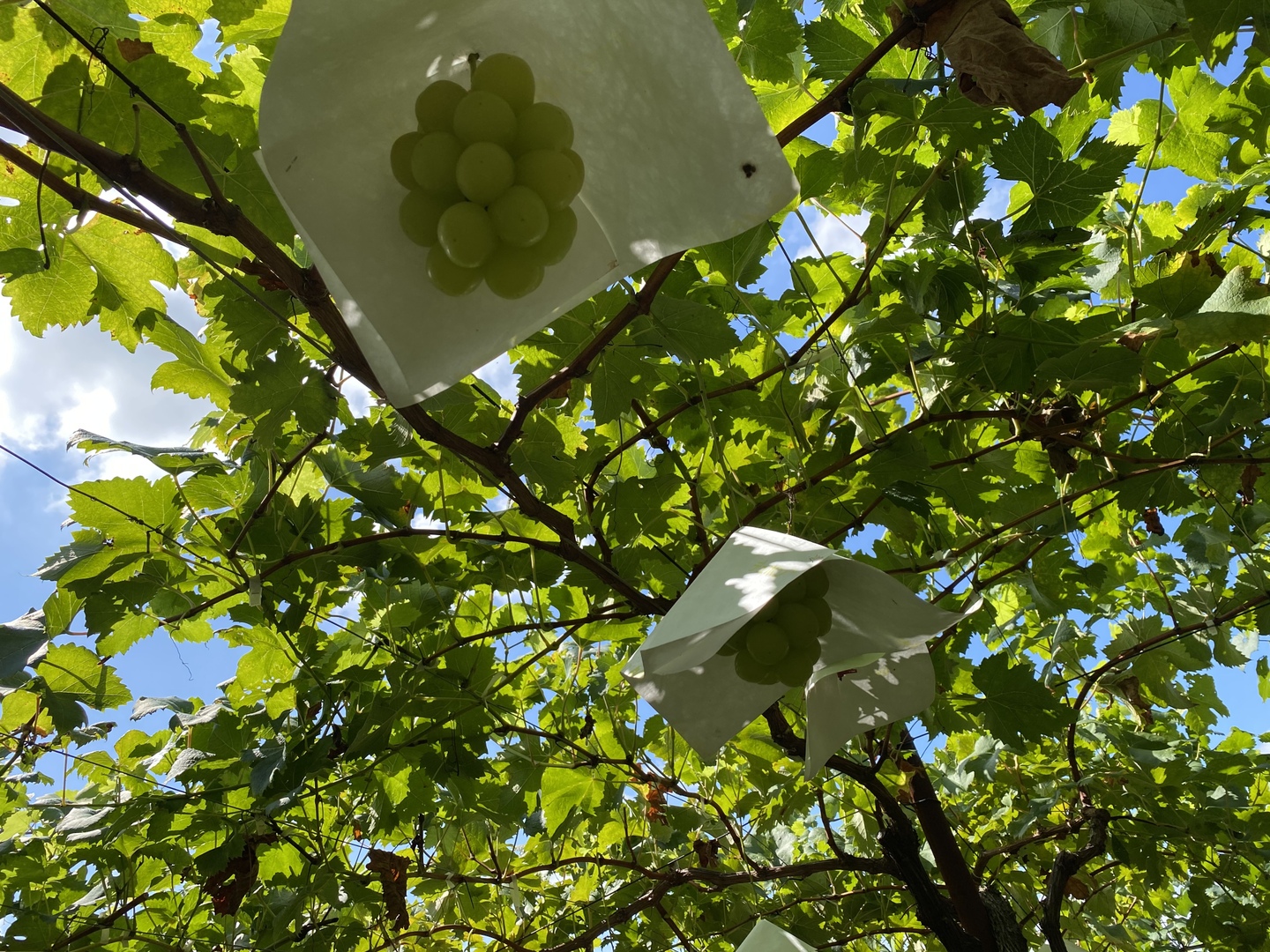 当園は国連で採択されたSDGsに賛同し、ビニール資材は極力使用せず、雨除けビニールやハウスは一切使用しない露地栽培にこだわり、ぶどうを雨から守るカサはリユース可能なタイベックカサを使用しています。剪定した枝類も焼却処分せずにそのまま細かく切って畑に戻して循環させています。