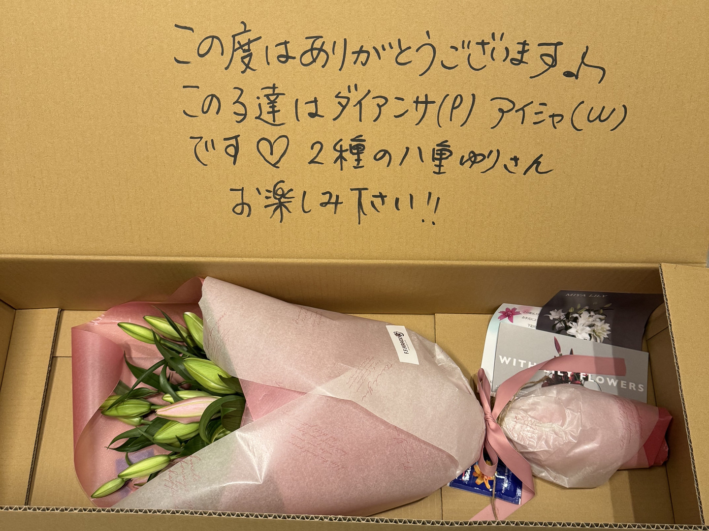 【ギフト商品】♥八重ユリ5本♥ギフトラッピング付き■特記事項にに白orピンクorMixか必ずお書きください!記載がない場合はMixでお送りいたします。