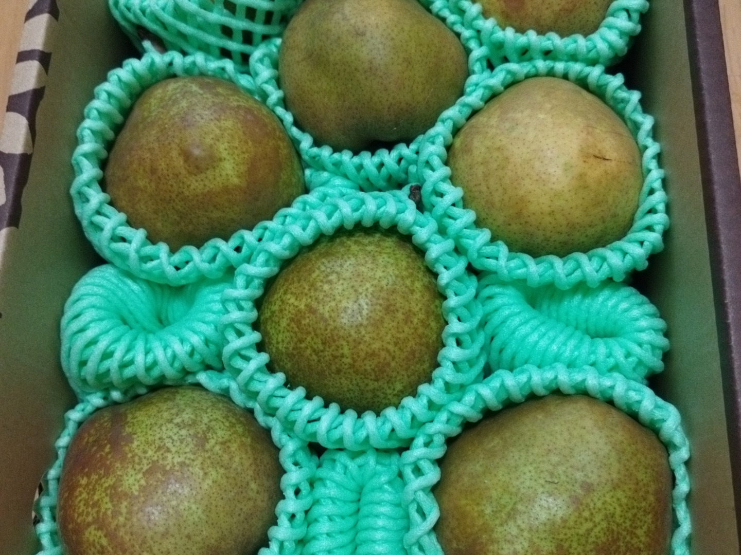 洋梨は収穫後、冷蔵庫で予冷し落ち着かせます。そのあと15~20度前後の部屋で5日~10日追熟します。