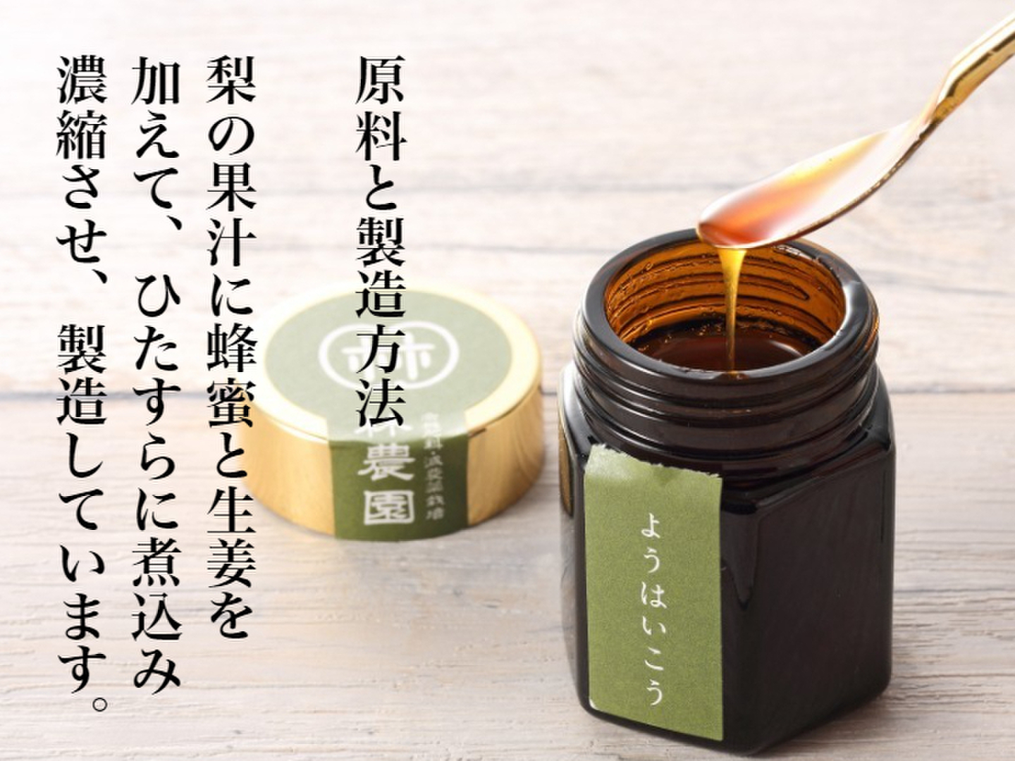 - 原材料は梨とショウガと蜂蜜のみ