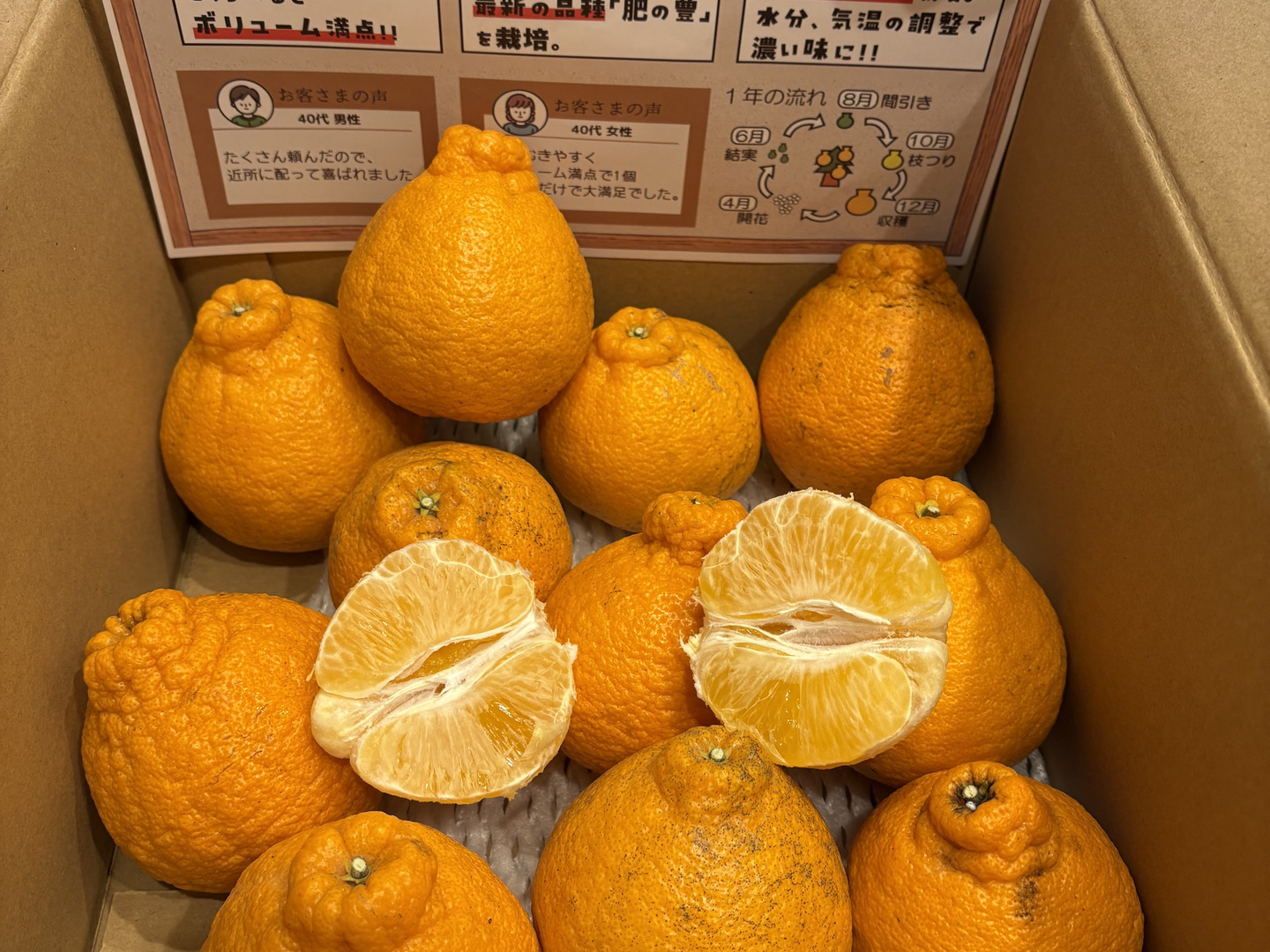 商品について あわせ買い対象 同生産者の別の「あわせ買い対象」商品と一緒にご注文いただくと、送料をまとめてお届けできる場合があります。 生産者からのお知らせ ハナウタカジツは「会話のはずむ贈りもの」お祝いや誕生日に「おめでたい」感謝の気持ちを。お取り寄せも自分への「ごほうび」として。電話でのお礼のやりとり、おすそわけしたときの対面の会話、手紙でのゆっくりとした関係。そこでハナウタカジツが「会話がはずむ」きっかけになれば、うれしいです。 もっと見る 内容 家庭用どすこい!!横綱みかん 訳あり 生産者都合による訳あり 重量・容量 約4kg 発送 佐川急便 送料 ¥ 常温便 + ¥ 0 数量1点ごとに送料が発生します。 種別 果物 みかん・柑橘類 果物 その他柑橘 不知火 産地 熊本県 慣行栽培 果物 家庭用 不知火 熊本県x果物 熊本県xみかん・柑橘類 熊本県xその他柑橘 熊本県x不知火 賞味期限 / 保存方法 発送から7日間 常温 訳あり 生産者都合による訳あり 少々キズあり、大小まざり もっと見る 商品説明 どすこい!!横綱みかん「どすこい」の頭文字を使って「ど」でかい「す」なおな「こい」味みかんデコポンの品種として知られる不知火みかんを、さらに進化させた最高級品種「肥の豊」。それが、「どすこい!!横綱 みかん」です。たっぷりと果汁を含んでいるため、食べ応えも抜群で、味わいもパワフル!さらに、チャームポイントの“デコ”が相撲取りのちょんまげのように見えることから、「どすこい!!横綱 みかん」と名付けました。2015年のはじめには、「どすこい!!横綱 みかん」の名前と存在感、味わい深さに惹かれたと、相撲の聖地として知られる東京・両国国技館前の飲食店から、取引のオファーをいただき、実際にお店のひと皿として提供していただいたこともあります。--平成15年に熊本で生まれたこの品種は、味にばらつきが出にくく、酸味も控えめ。以前はハナウタカジツでも不知火を栽培していましたが、お客様にもっと甘くておいしいものを提供したいという思いから、3年かけて植え替え&移行に取り組み、ようやく安定的に提供できるまでになりました。いつでも甘くておいしい果実を食べたいとおっしゃるお客様に特におすすめしたい逸品です。 もっと見る この商品のことをお友達にもシェアしませんか ポスト シェア