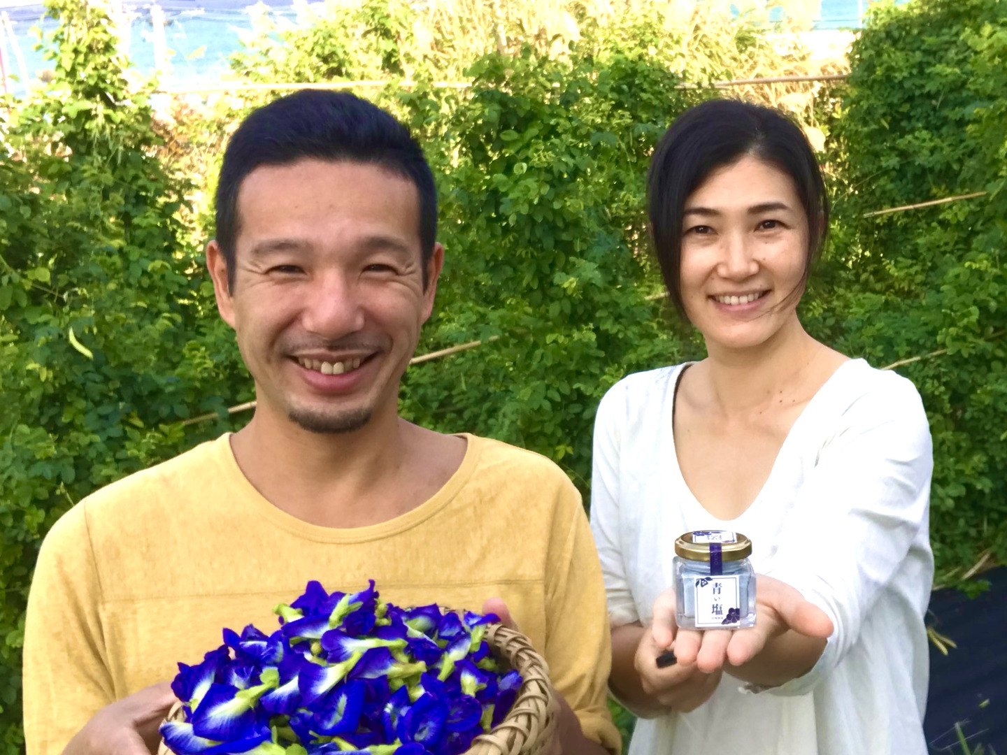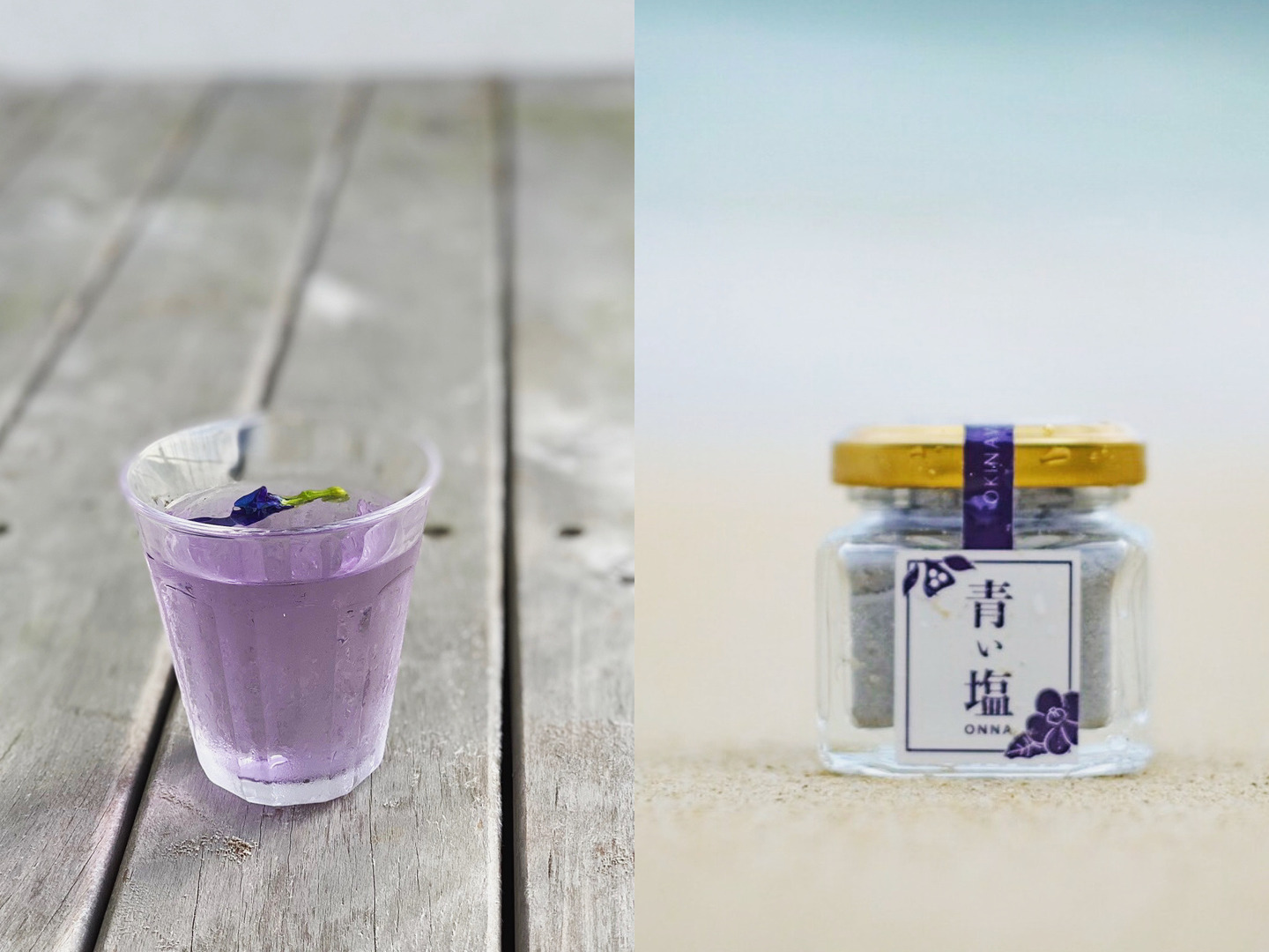 バタフライピーを含んだ沖縄の海水100%のお塩。旨味がありながら、素材の味を邪魔しない、どんなお料理にも合うお塩。バタフライピーのアントシアニンがレモンなどの酸性のものに反応して、青からピンクに変わる不思議なお塩!