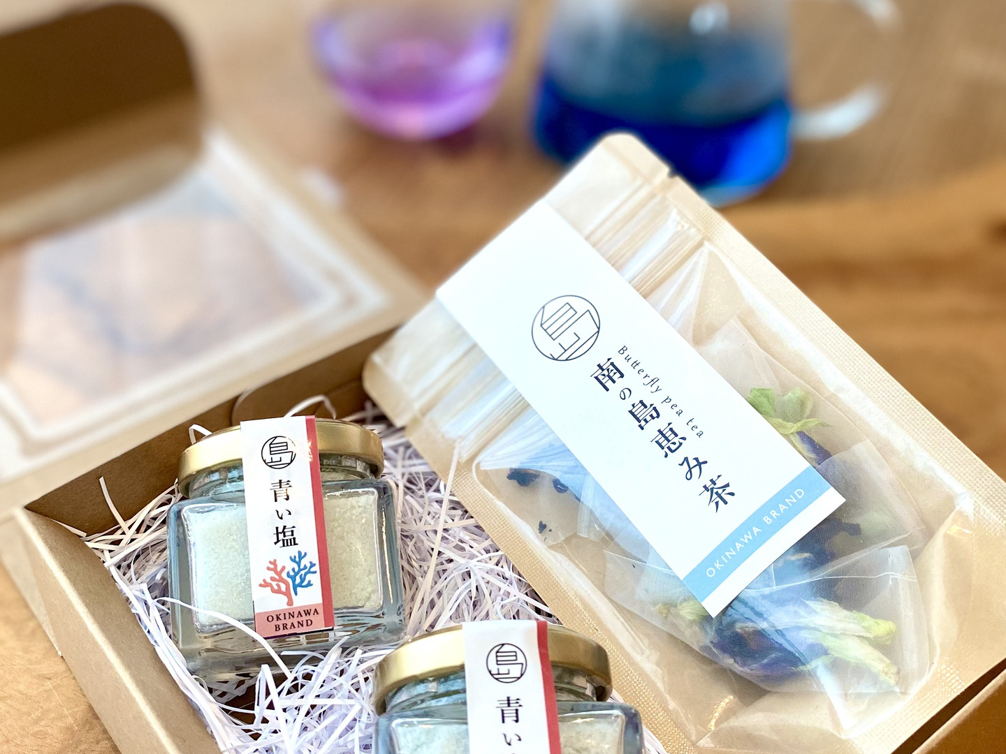 青い塩と南の島恵み茶でリゾート気分を味わえます。