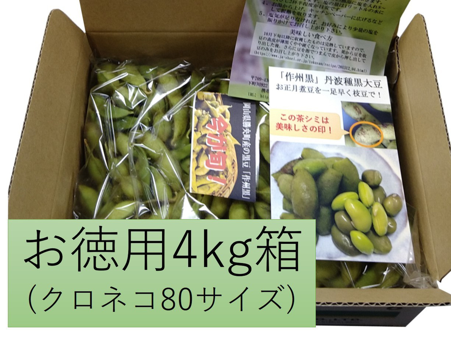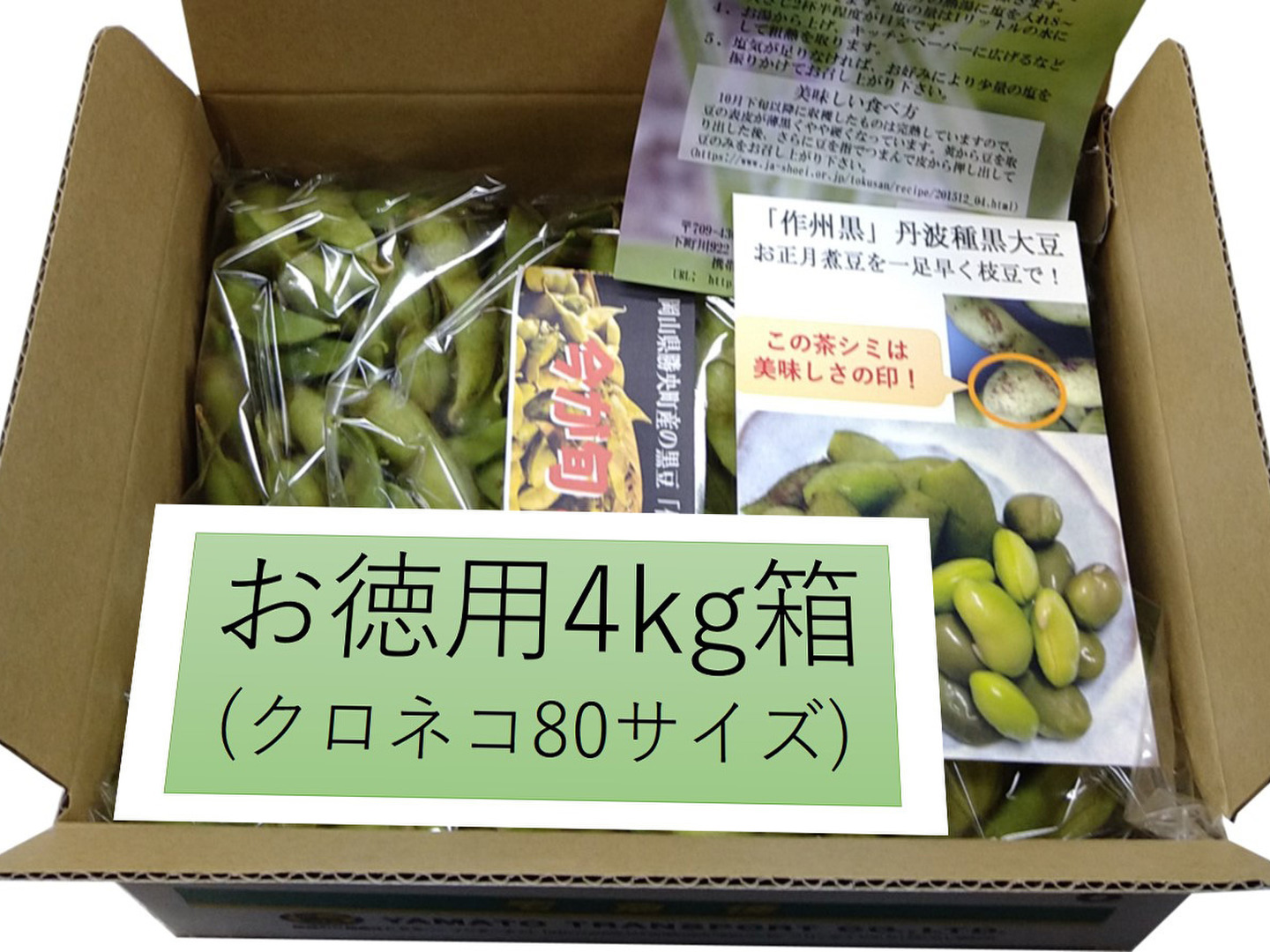 お正月の黒豆でお馴染みの黒大豆(丹波種)が、10月中旬から枝豆として正に旬を迎えています。ビールシーズンのおつまみ用の白大豆枝豆に比べ、莢が巨大で風味が濃く、食べ応えがスゴイです。1キログラムの量でも、食べ始めたら止まらい、あっと言う間の完食を保証します!