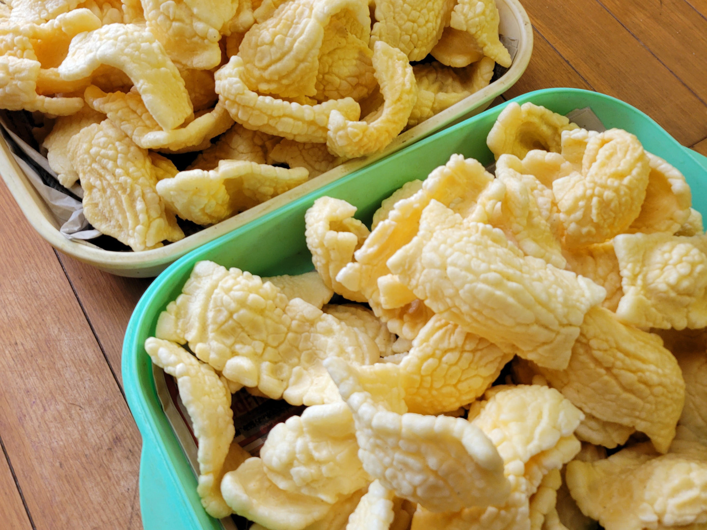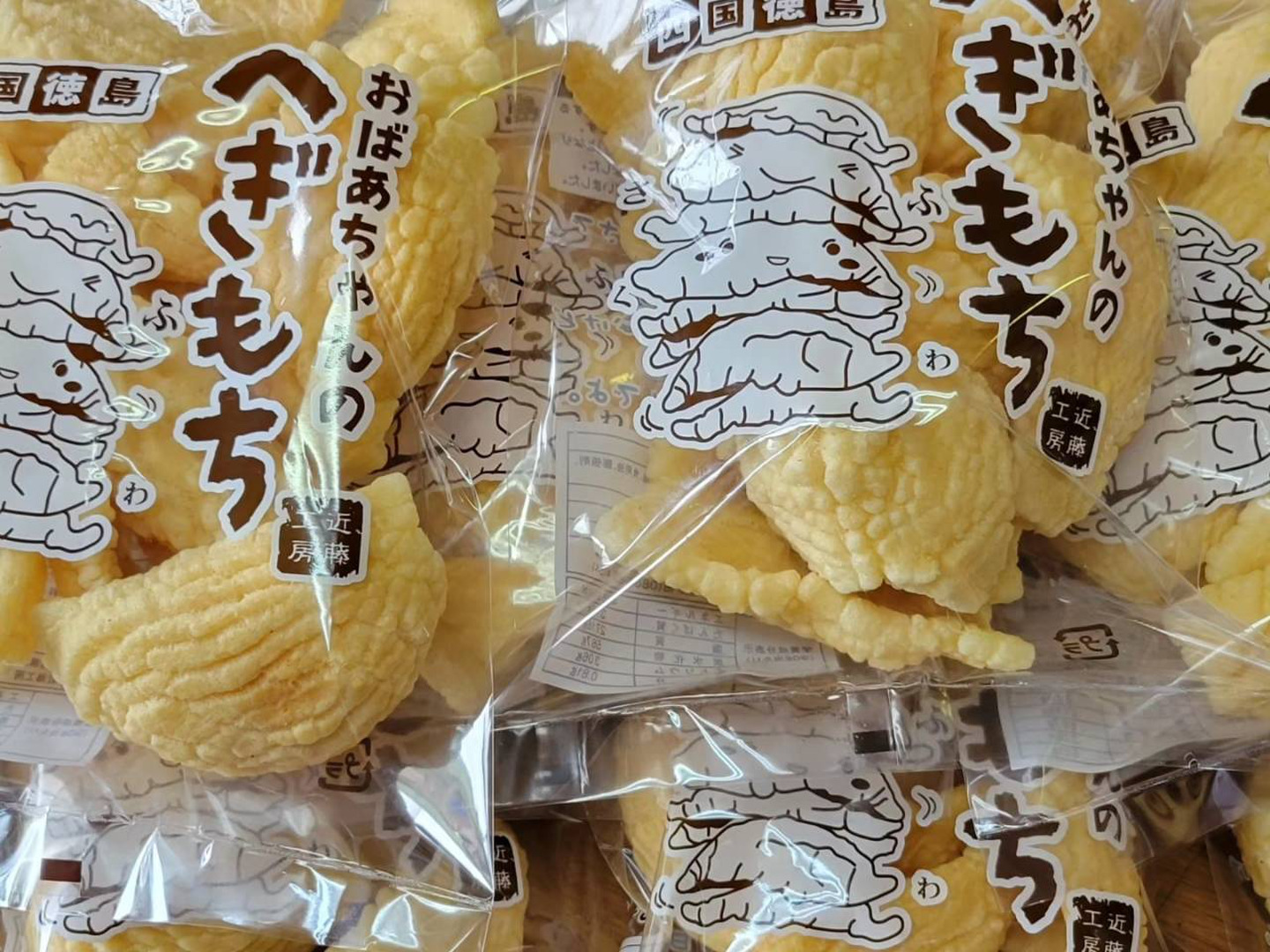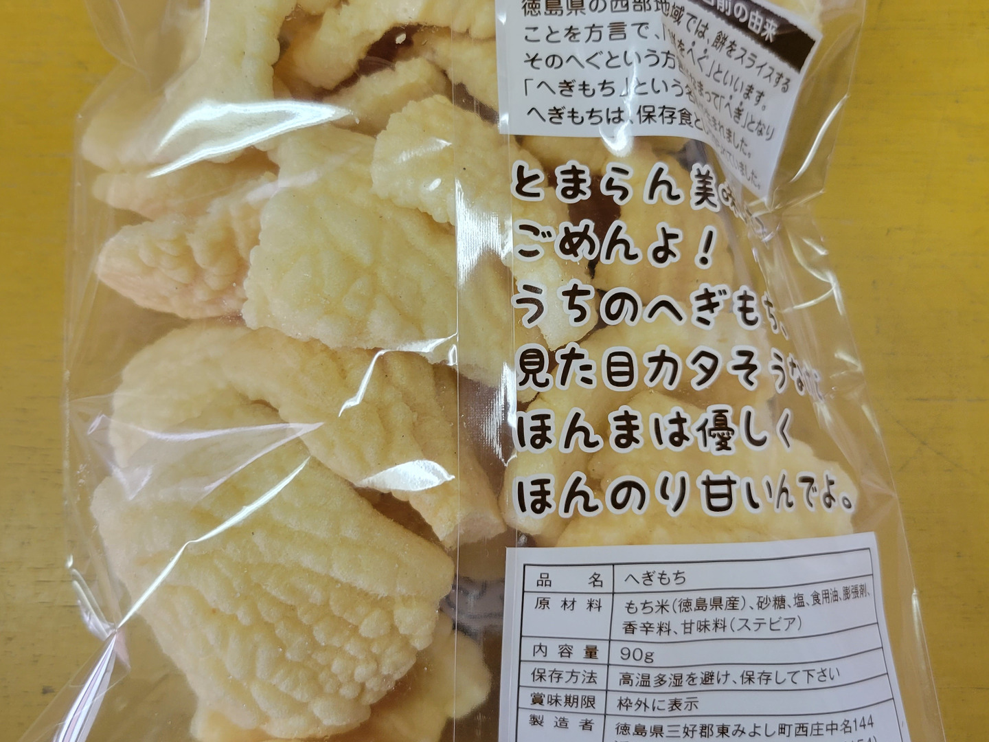 100年以上前から、冬の保存食としてもち米を油で揚げてつくる手作りおやつです。餅を薄くはがすことをこの地方では『餅をへぐ』と言います。それを油で揚げてつくるおかきを『へぎもち』と呼ばれどの家庭でもつくり親しまれておりましたが、今はほとんど作っておりません。この伝統のおかきを残していこうと揚げ方の工夫をして独自の製法で30年前から産直やスーパーで販売し地元では人気のおかきです!