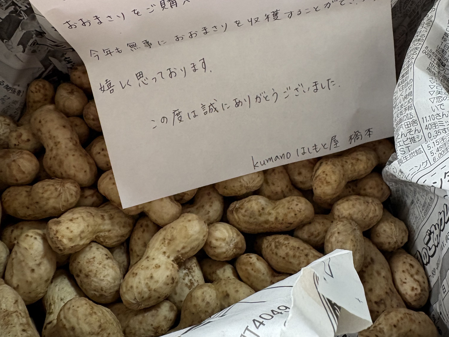 落花生は早熟のものも美味しいですが、kumanoはしもと屋はこの時期に採れた完熟に近い甘味とコクのある落花生をお勧めいたしております(なかには早熟なものも多少入ります)。