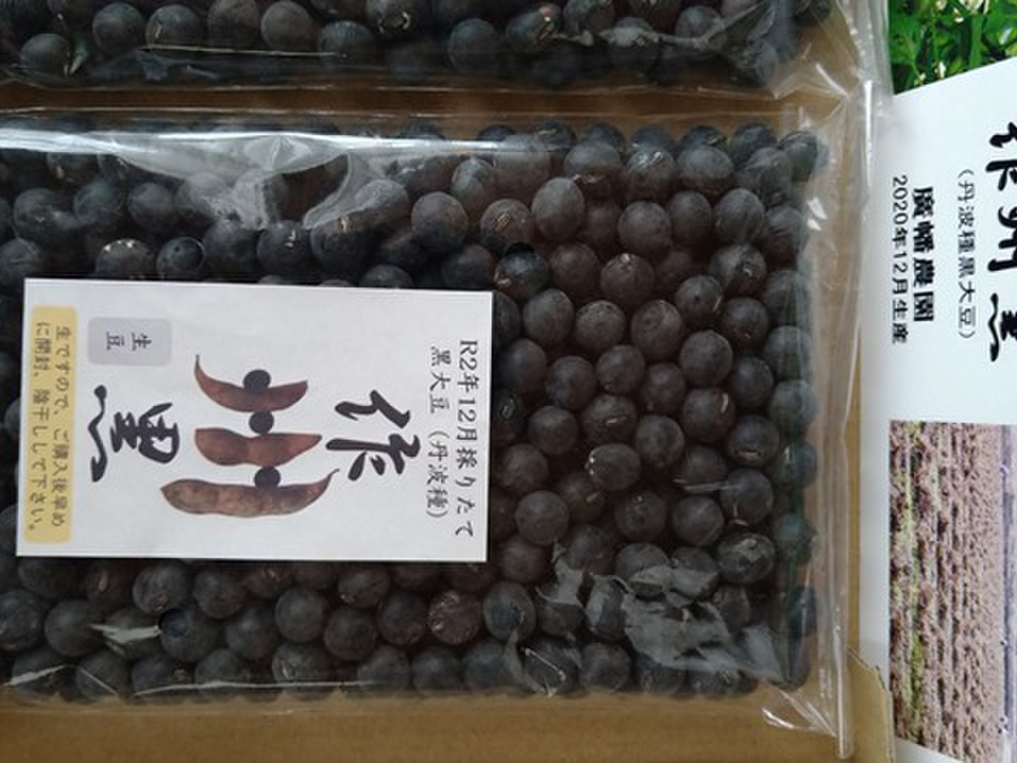 今年12月中旬の採れたて。丹波種黒大豆「作州黒」250袋×2個。