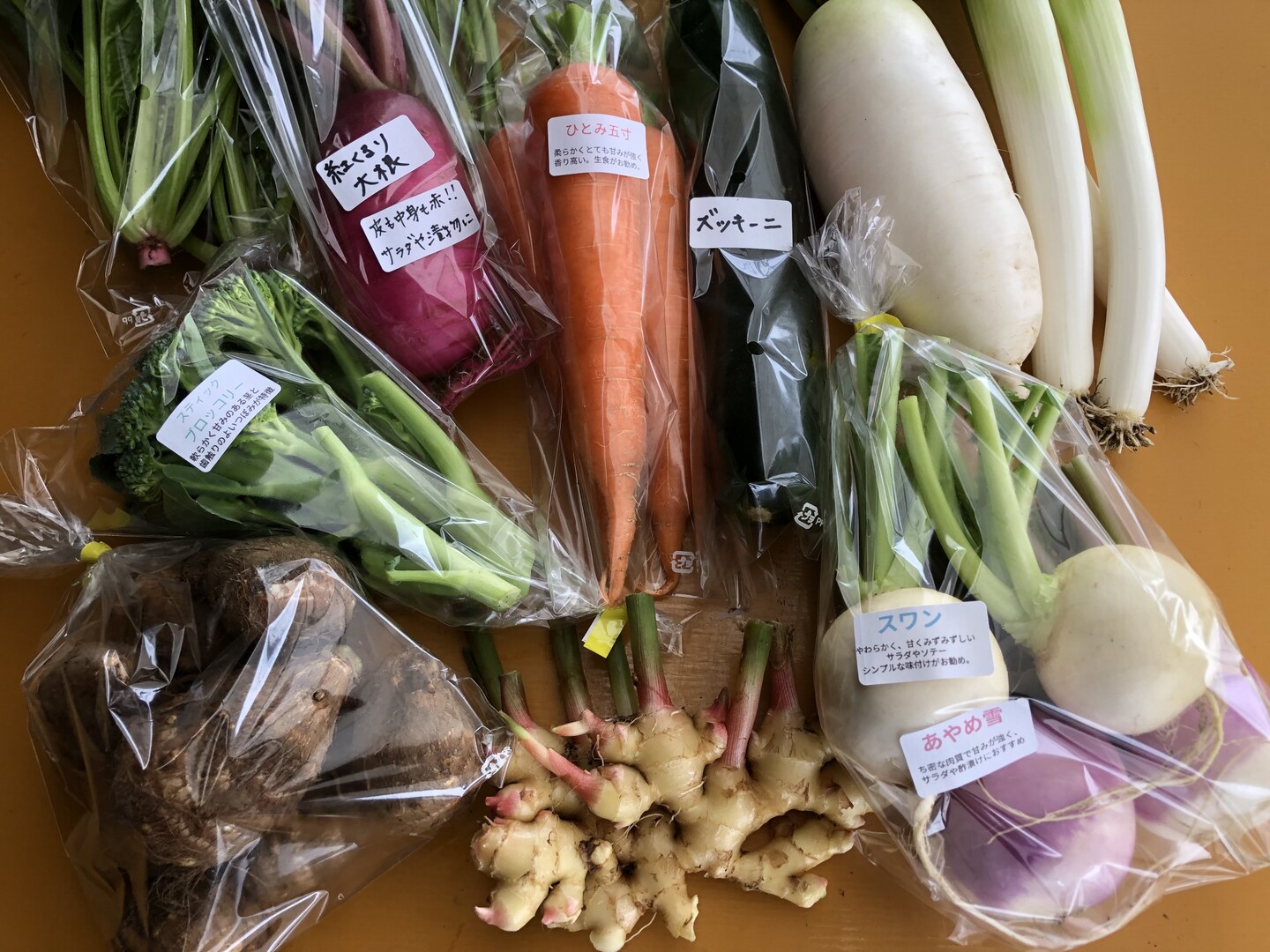 スティックブロッコリー、生姜、ミニ大根(白、紅しぐれ、紅芯大根)、カブ(スワン、あやめ雪)、ホウレンソウ、春菊、ニンジン(ひとみ五寸、アロマレッド)、キャベツ(みさき)、ルッコラ、ズッキーニ、ネギ等の中から9~11品目程度。