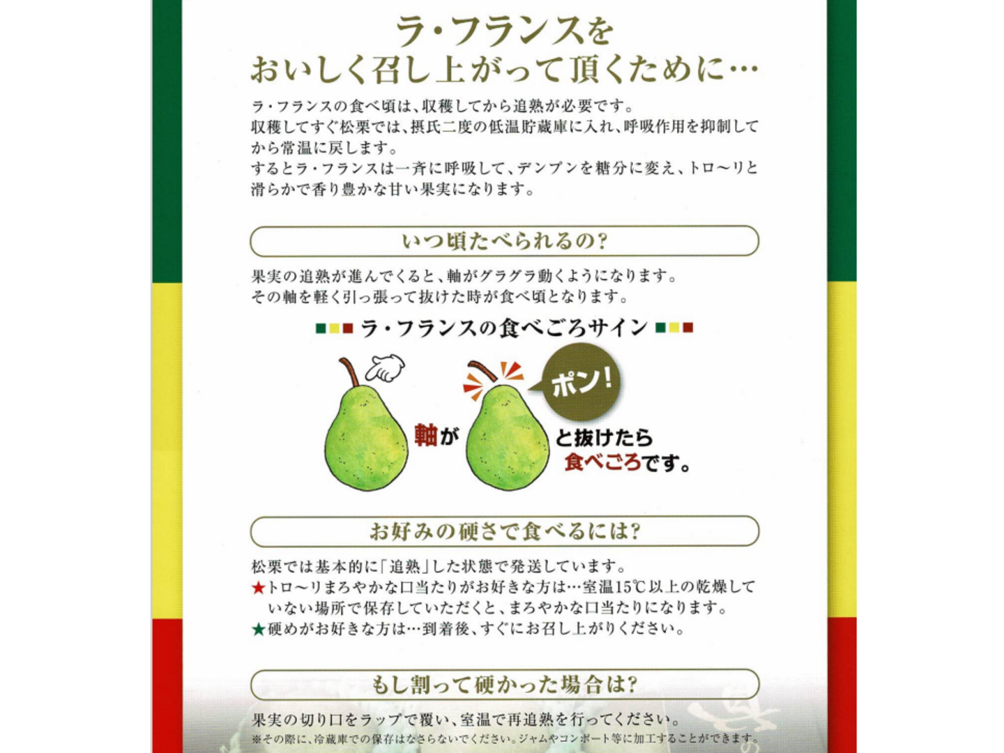 ・商品は収穫後、一定期間冷蔵庫で保管し、その後暖房の効いた部屋で追熟させてから順次発送させていただきます。そのためお届け日の指定を承ることが出来かねますのでご了承下さい。