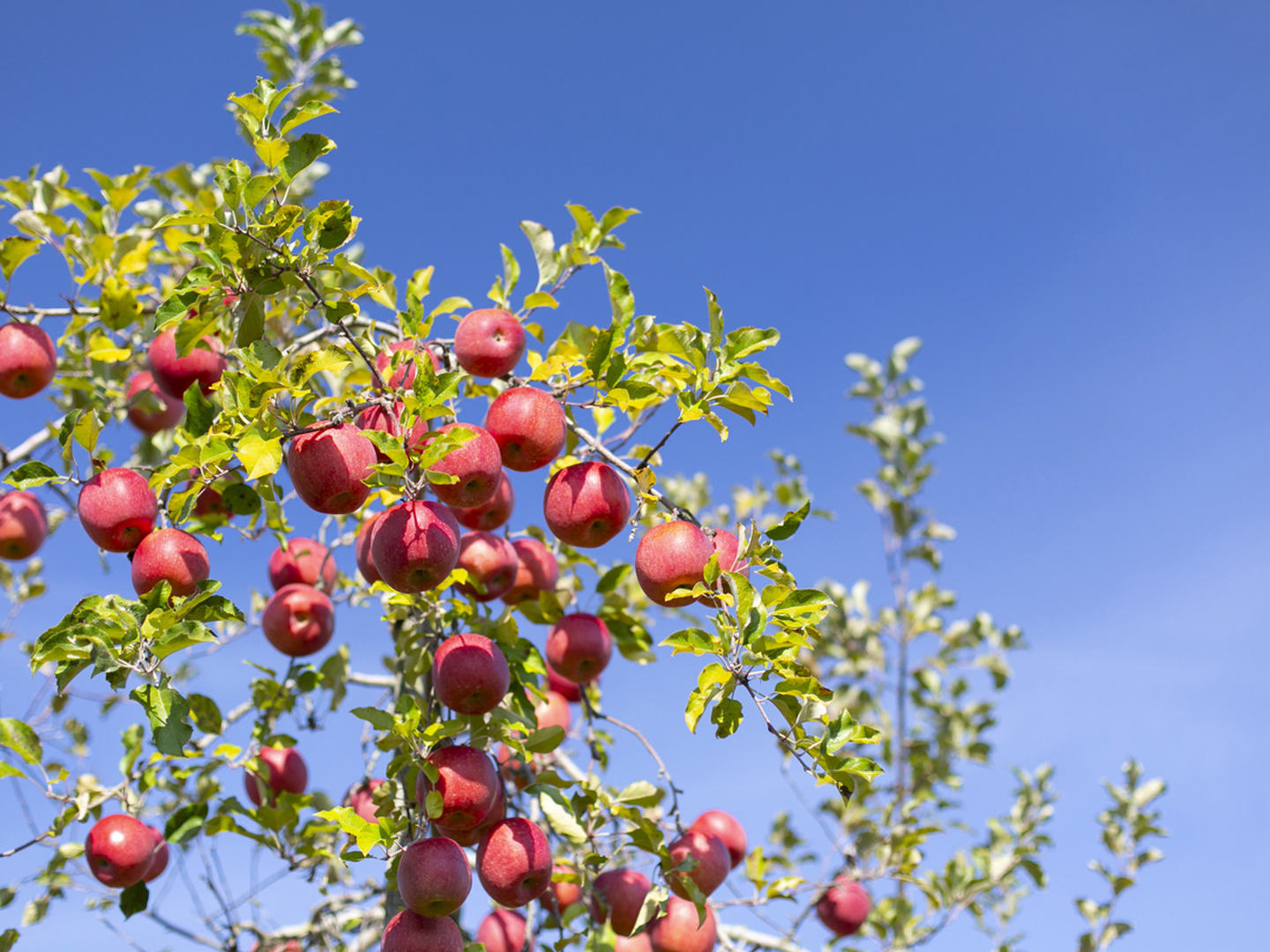 幹が太く大地に深く根をはる成木は、お天気に左右されにくい生命力の強さが特徴です。栄養も水分もしっかり吸い上げるため、当園のわい化栽培りんご(小さい木で均一なりんごを作る栽培方法)に比べ、果汁が多く、りんご本来の甘さやコク、風味あふれるりんごができます。