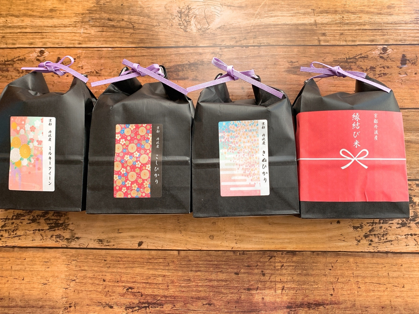 京都丹波産のコシヒカリ、キヌヒカリ、ミルキークイーン、縁結び米を1kgずつ小分けにした食べ比べセット。
