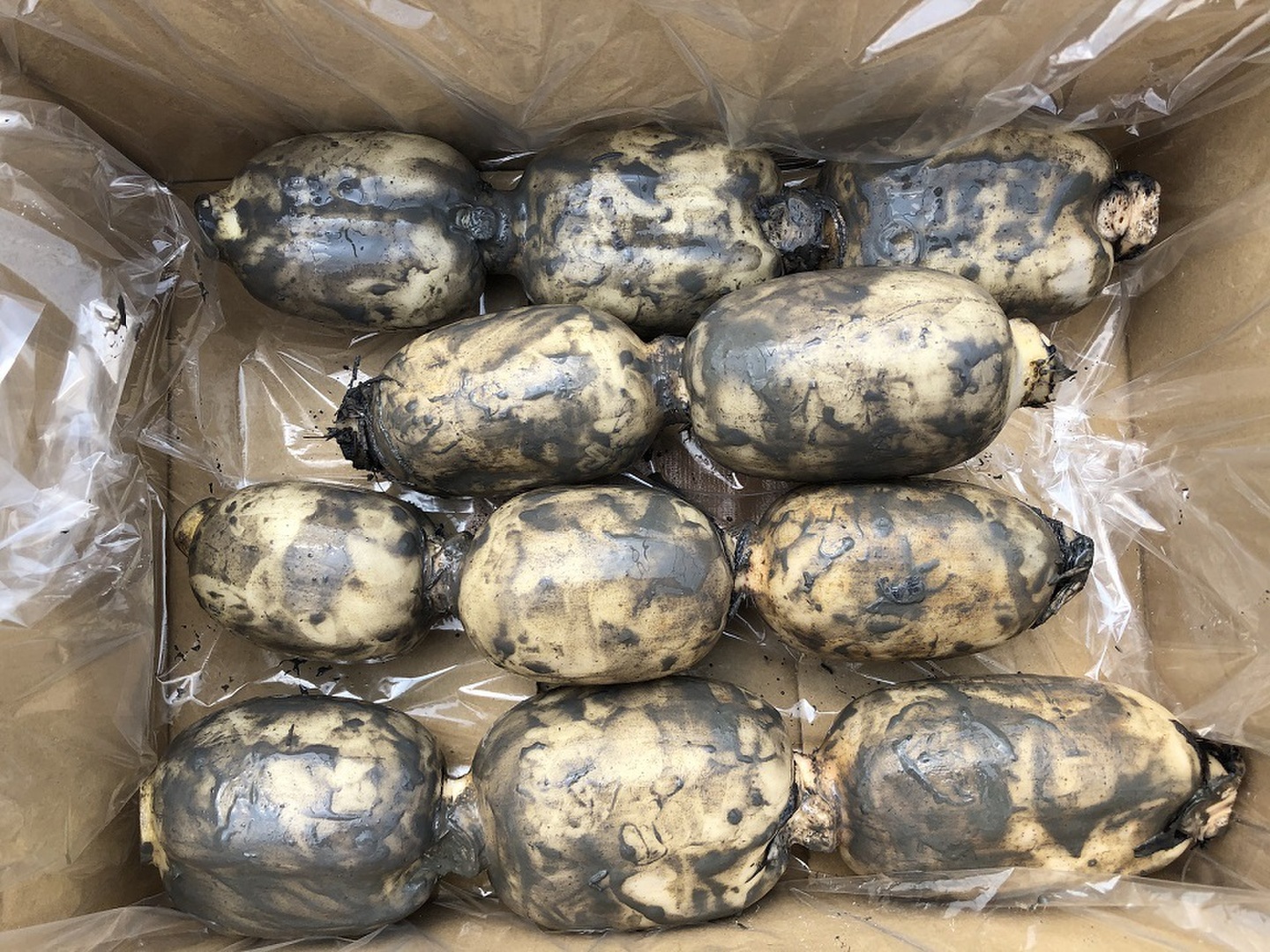泥付きになります。泥をきれいに洗い流しあと鮮度を保つためもう1度化粧泥を塗りなおします。