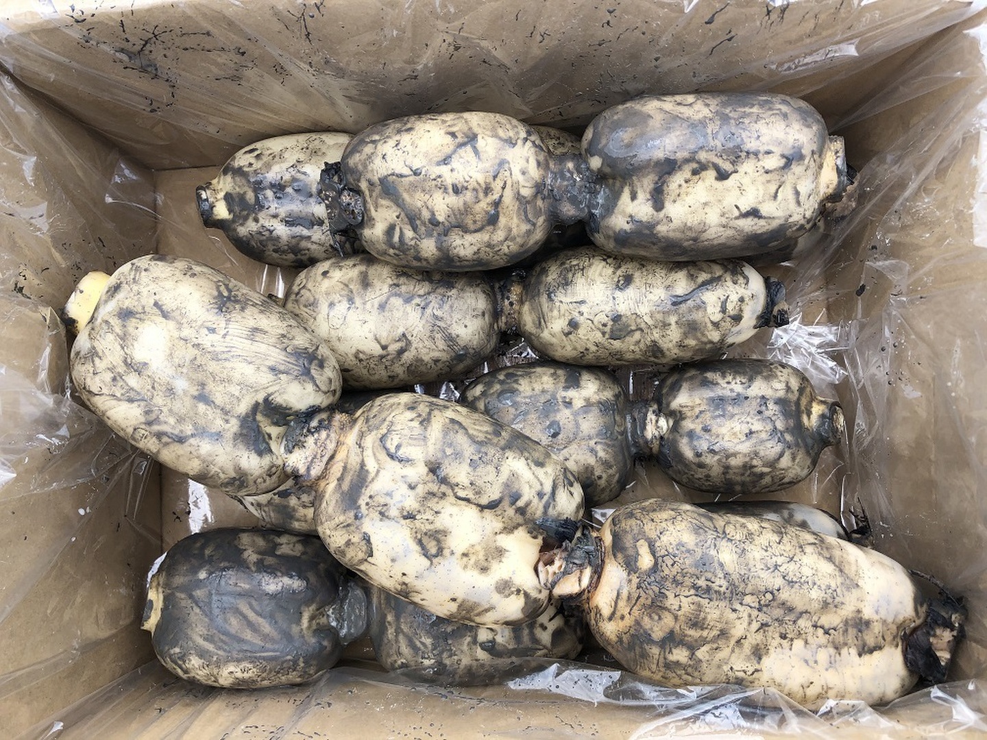 泥付きになります。泥をきれいに洗い流しあと鮮度を保つためもう1度化粧泥を塗りなおします。