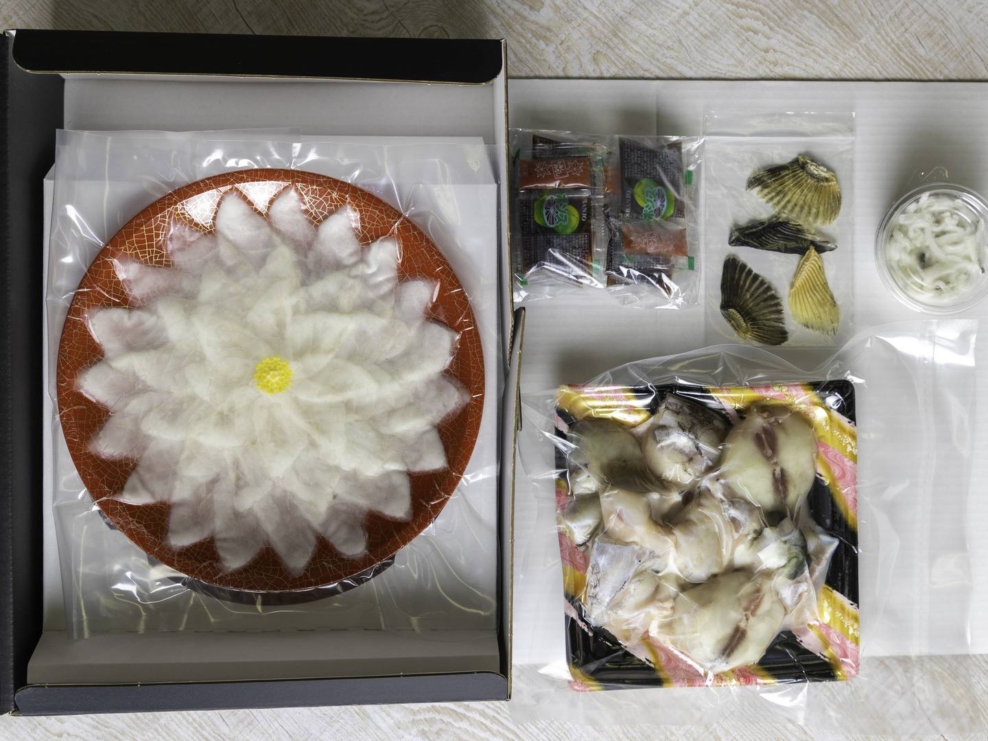| 内容 | 刺身 100g / 本皮 50g / 鍋用ぶつ切り450g/乾燥ヒレ 4枚/ポン酢もみじおろし144g/身皮200g | ||||||