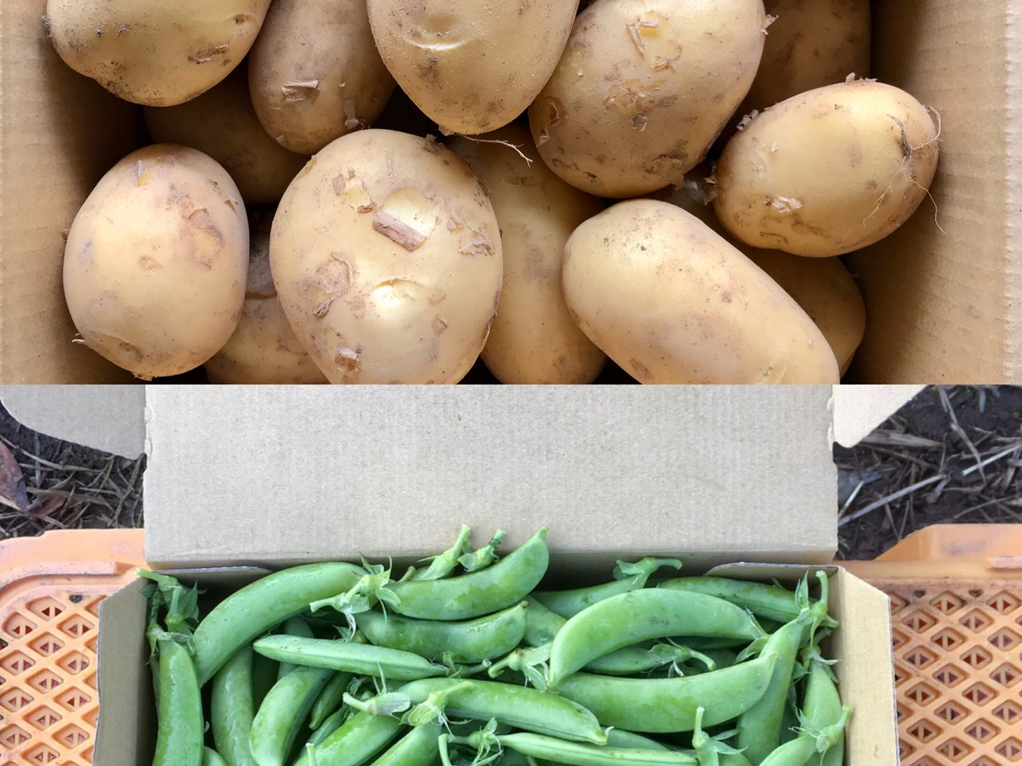 鹿児島産のスナップエンドウ1キロ前後・ジャガイモ(ニシユタカ)3キロ前後注文を受けてから、収穫日に収穫した箱込み4キロ前後を畑の空気も収穫しながらAB品大中小混合箱詰めして、当日発送します^_^