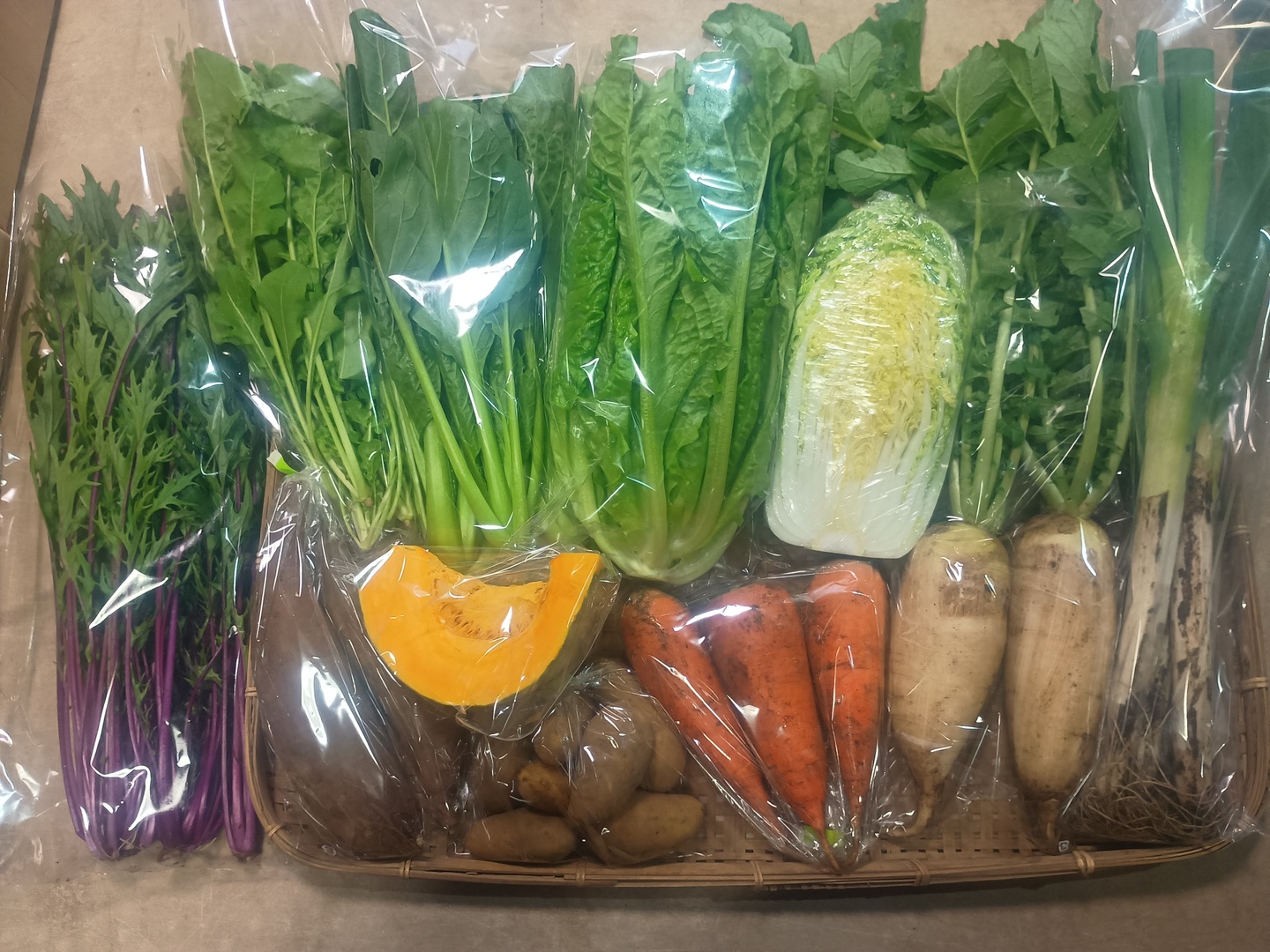 ※写真2枚目は2025年11月14日に実際にお送りした野菜セットです。(小松菜、紅水菜、ルッコラ、レタス、白菜、南瓜、大根、人参、サツマイモ、ジャガイモ、長ネギ)