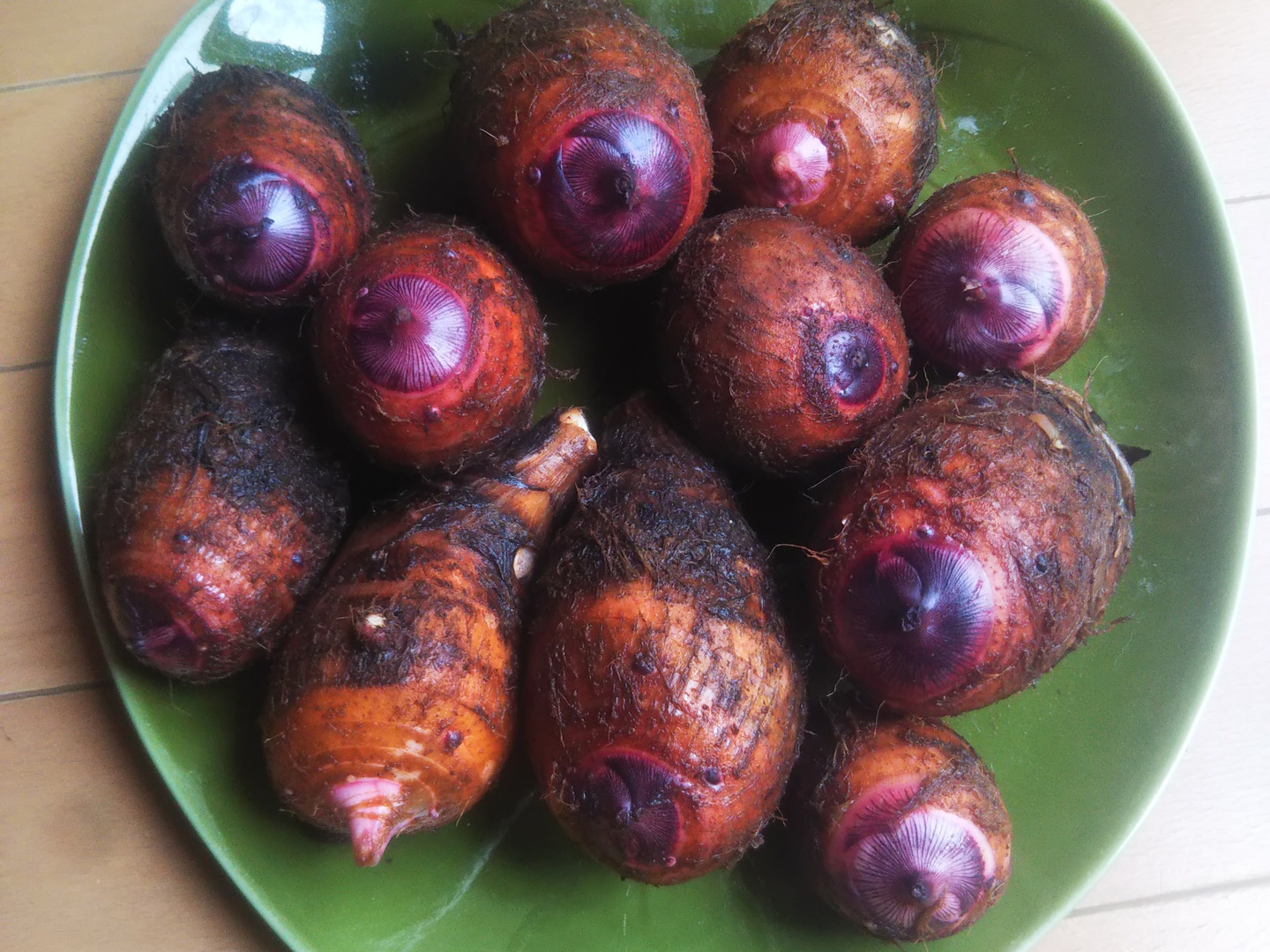赤目大吉は、鮮やかなピンク~赤色の芽が綺麗な里芋です。インドネシアのスラウェシ島から導入されました。「セルベス」の名称で流通される事が多く、唯一親芋も調理できる里芋です。