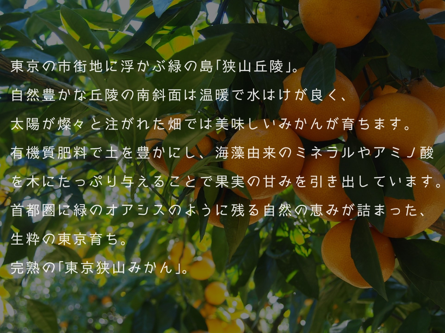 東京の市街地に浮かぶ緑の島「狭山丘陵」の南斜面で栽培されるブランドみかんです。甘みと酸味のバランスが抜群で濃厚な味が特徴。市場流通がほぼ無い非常に希少な東京産みかんです。