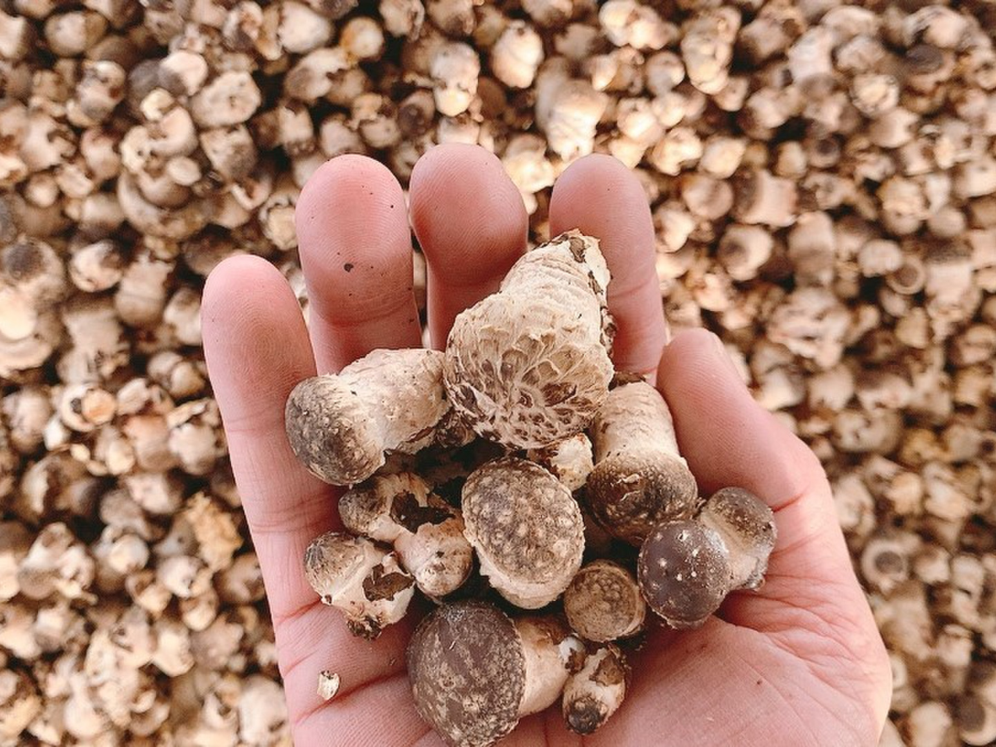 培養期間中にエアコンを使用せず、ハウスの換気や水シャワーだけで細心の注意を払い温湿度調節しながら半年間ゆっくりと時間をかけて菌床を培養させることで、肉厚でおいしい椎茸が収穫できます。