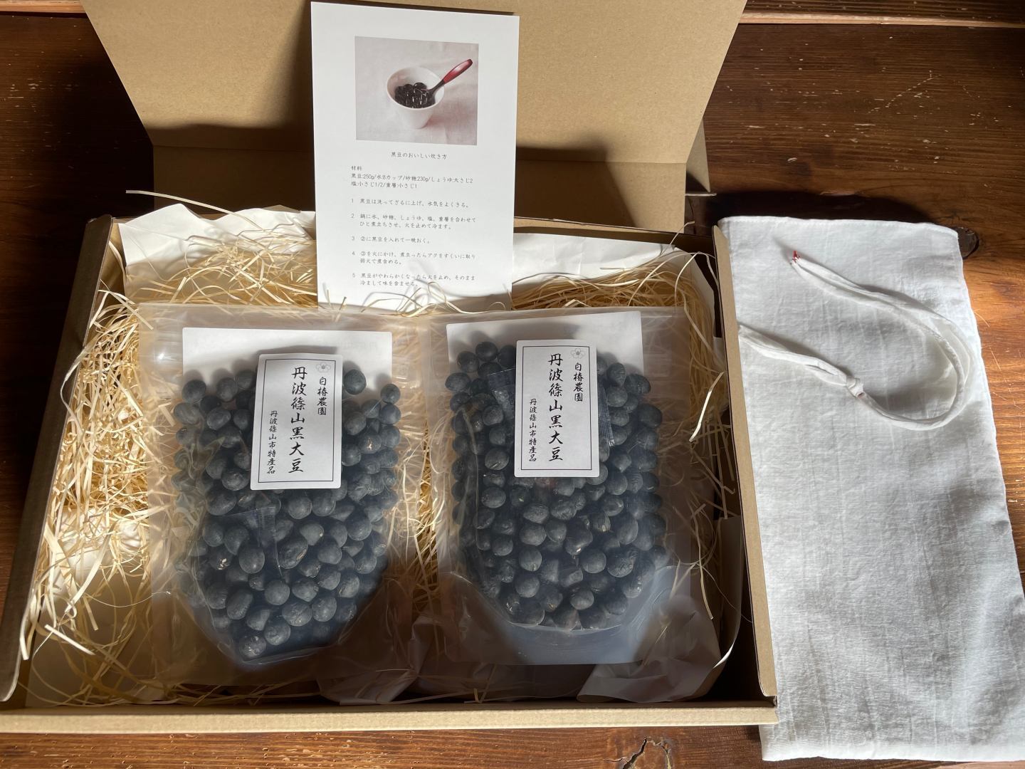 黒大豆250g 2点と白椿オリジナルの豆袋も付属します。
