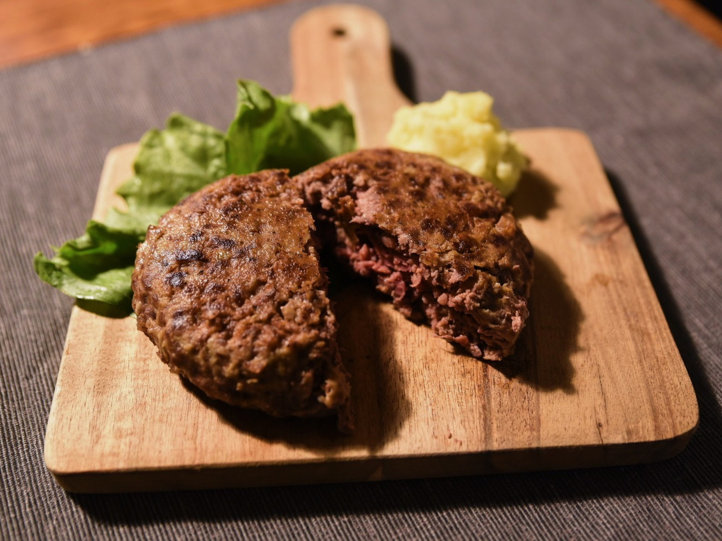 贅沢にも鹿肉脂を入れて挽肉を作っているので塩胡椒の味付けだけでも美味しくいただけます。