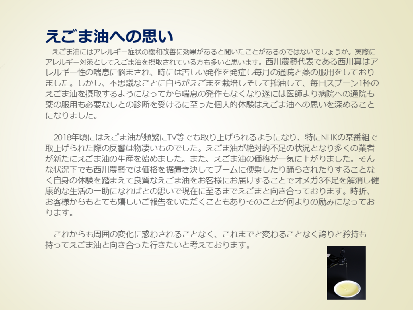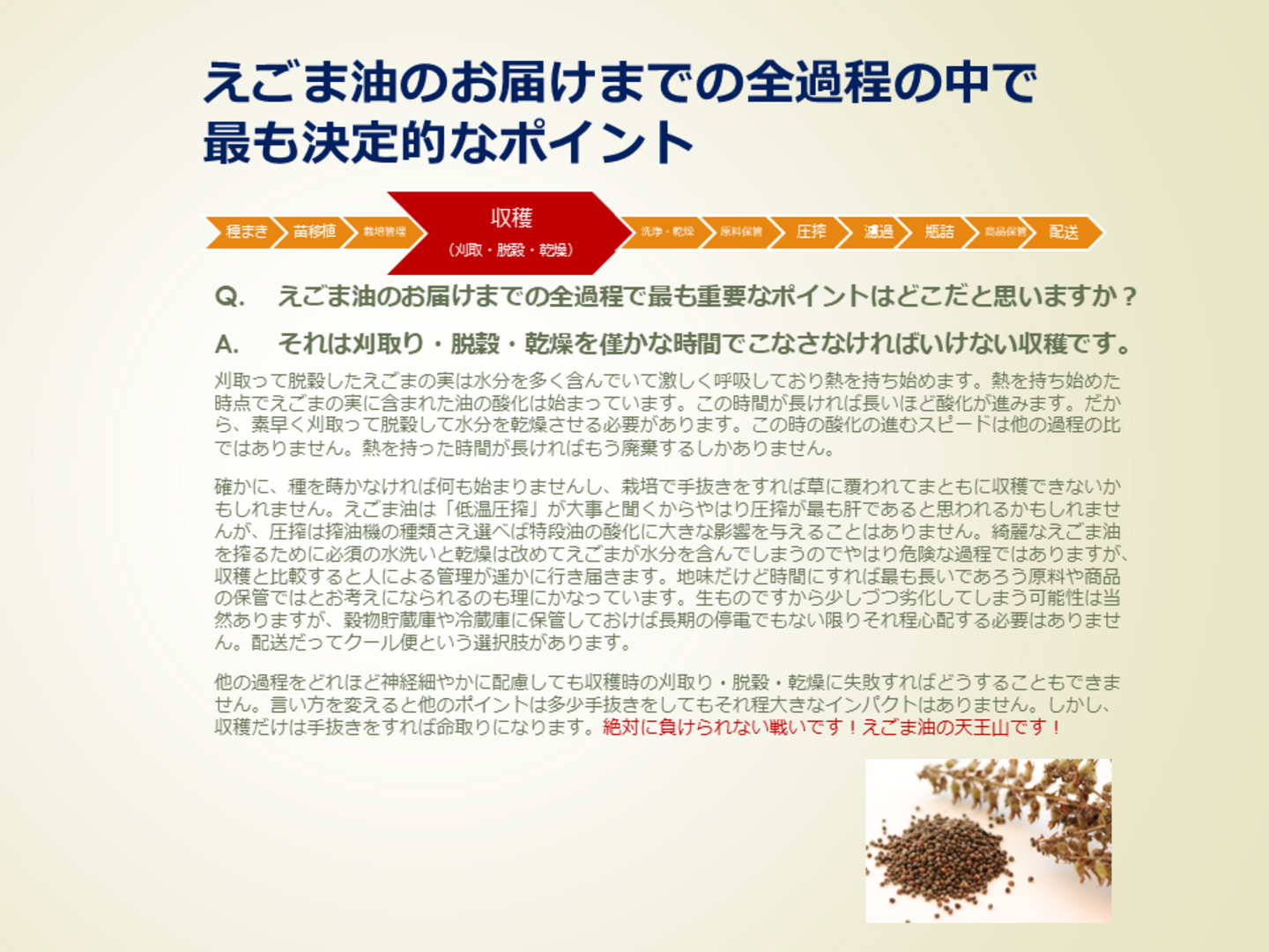 - 4 栽培から瓶詰まで完全非加熱の低温圧搾生搾りの油!