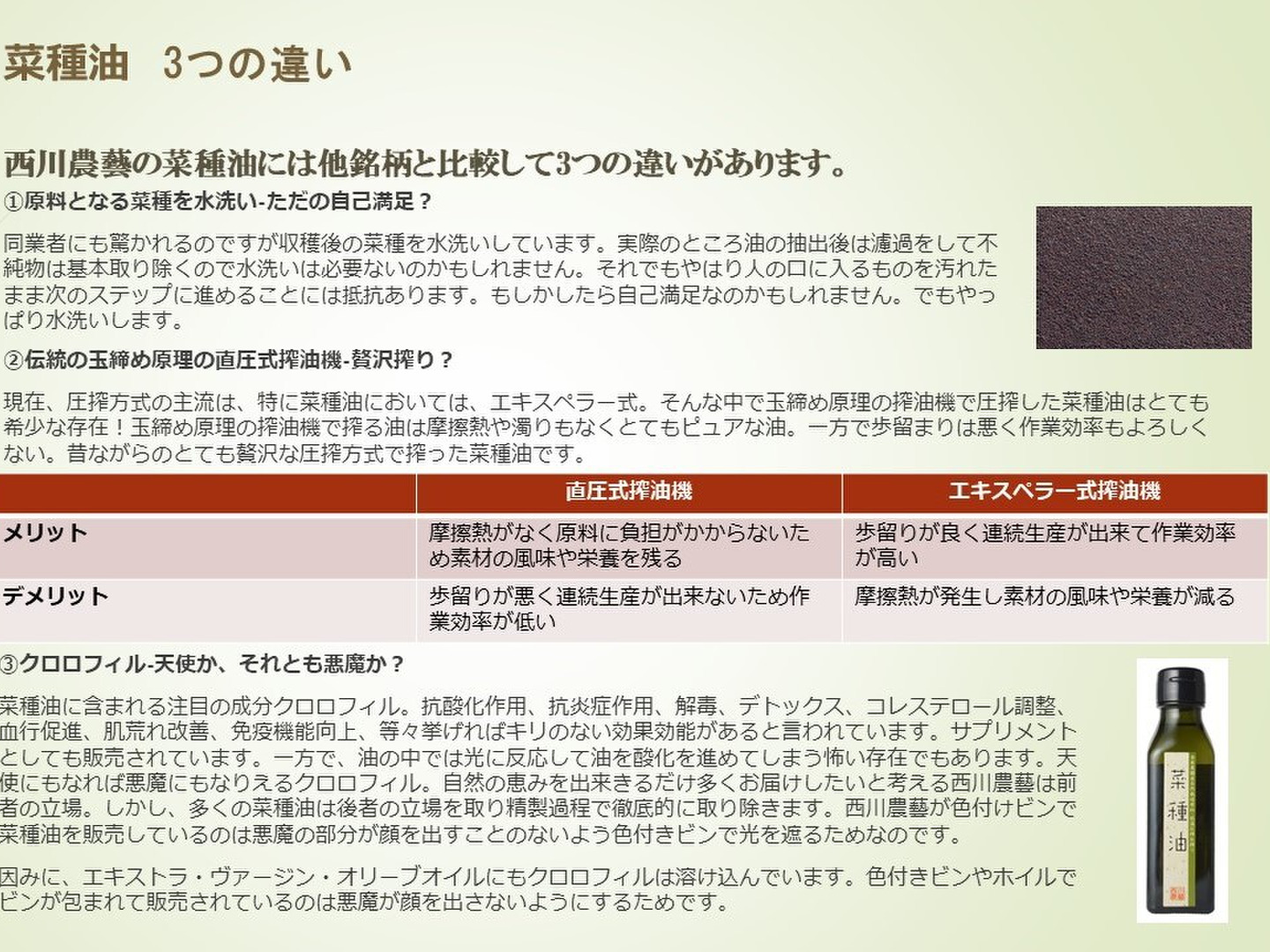 - 4 栽培から瓶詰まで完全非加熱の低温圧搾生搾りの油!