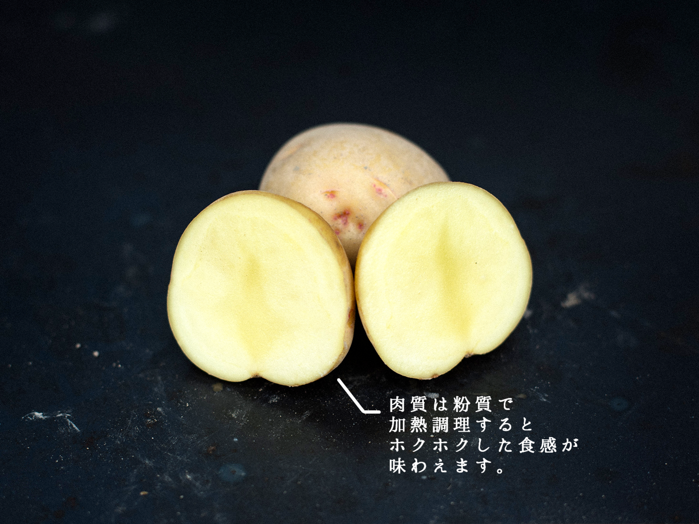 男爵系とメークイン系の中間のようなジャガイモです。メークインのようなネットリしたコクと、男爵系のようなホクホクした食感を併せ持っています。程よく煮崩れしますので、煮物料理などにも適していますが、特徴は皮を剥いた後の非常に綺麗な白色です。ポタージュなどにすると食欲をそそる綺麗な色が出ます。また、非常に皮が薄いため、洗えばそのまま使うこともできます。今回は小さなSサイズの物も入れておりますので、洗っただけで包丁を使わずにそのままカレーや肉じゃがなどの料理にもご使用いただけます。