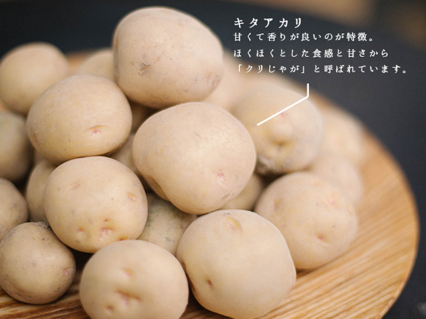 男爵系のジャガイモです。当農園で育てたジャガイモは小ぶりながらもホクホクとした食感と強い甘みは自信を持ってオススメします。じゃがバターなどジャガイモをそのまま活かす料理はもちろん、コロッケなどの揚げ物やポテトサラダなどの料理にもよく合います。キタアカリ特有の濃厚な黄色も相まって食欲をそそります。また、非常に皮が薄いため、洗えばそのまま使えます。今回は小さなSサイズの物も入れておりますので、洗っただけで包丁を使わずにそのまま料理にもご使用いただけます。