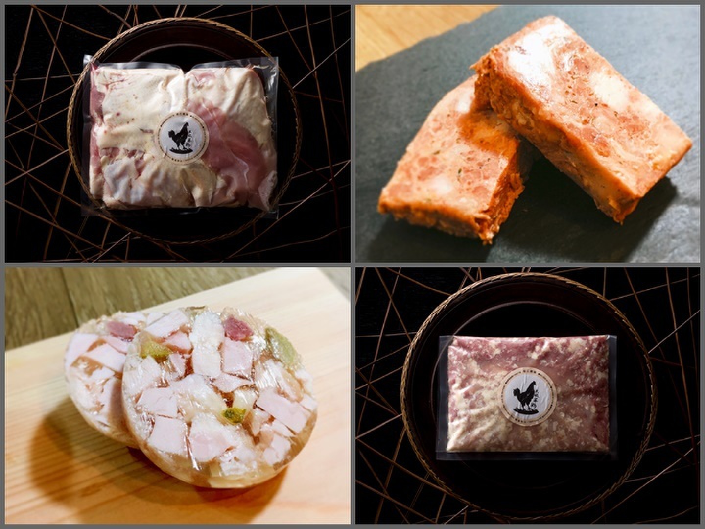 正肉 350g / 粗びきミンチ 300g / パテ・ド・カンパーニュ / 天城軍鶏のアスピック(ゼリー寄せ)