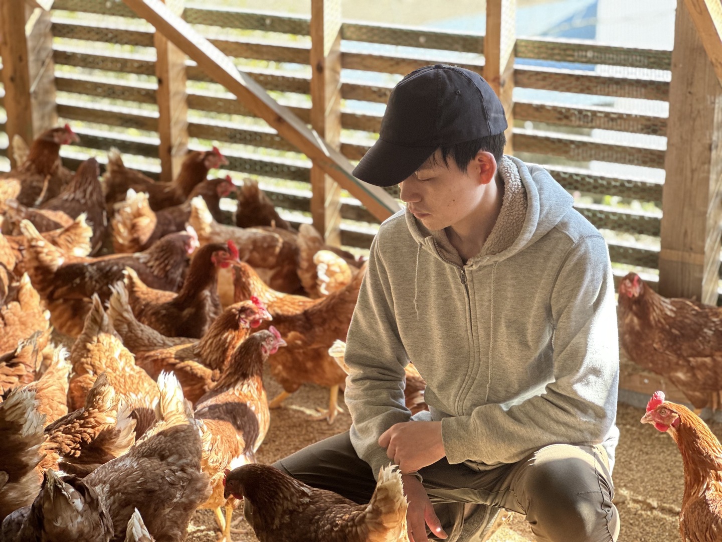 日本でわずか5%しか採用されていない「平飼い方式」の鶏舎では、陽の光を浴びながら、羽を広げて走り回る鶏たち。1坪あたり10羽以下という贅沢な飼育空間で、ストレスを限りなく減らした環境を整えています。