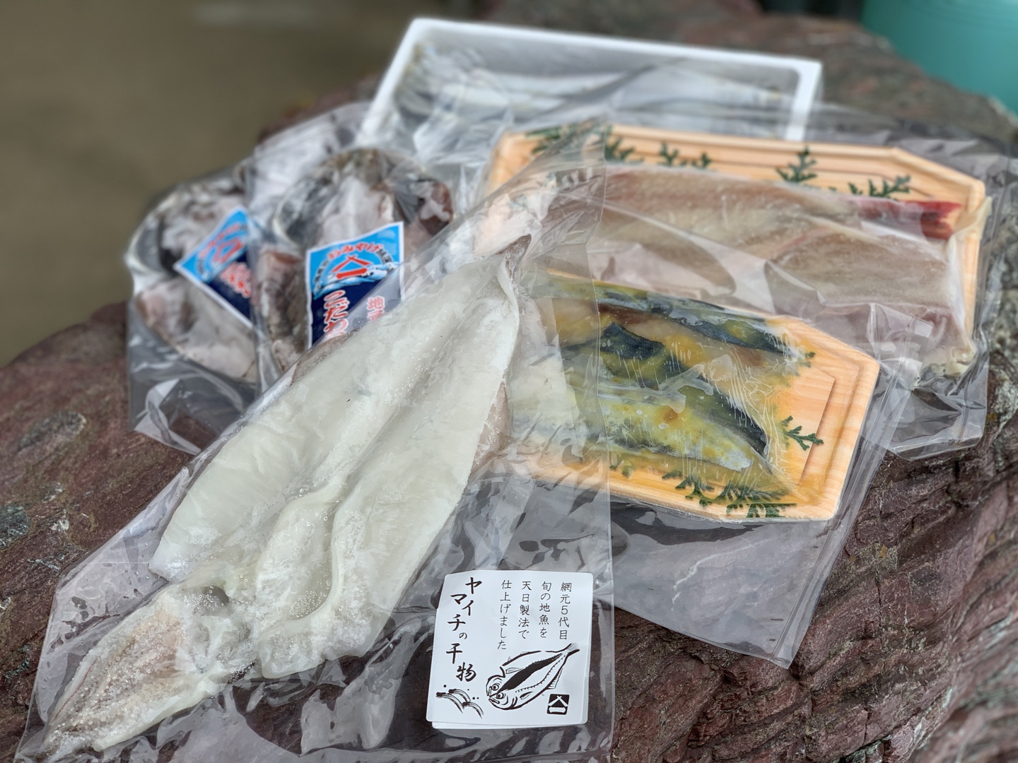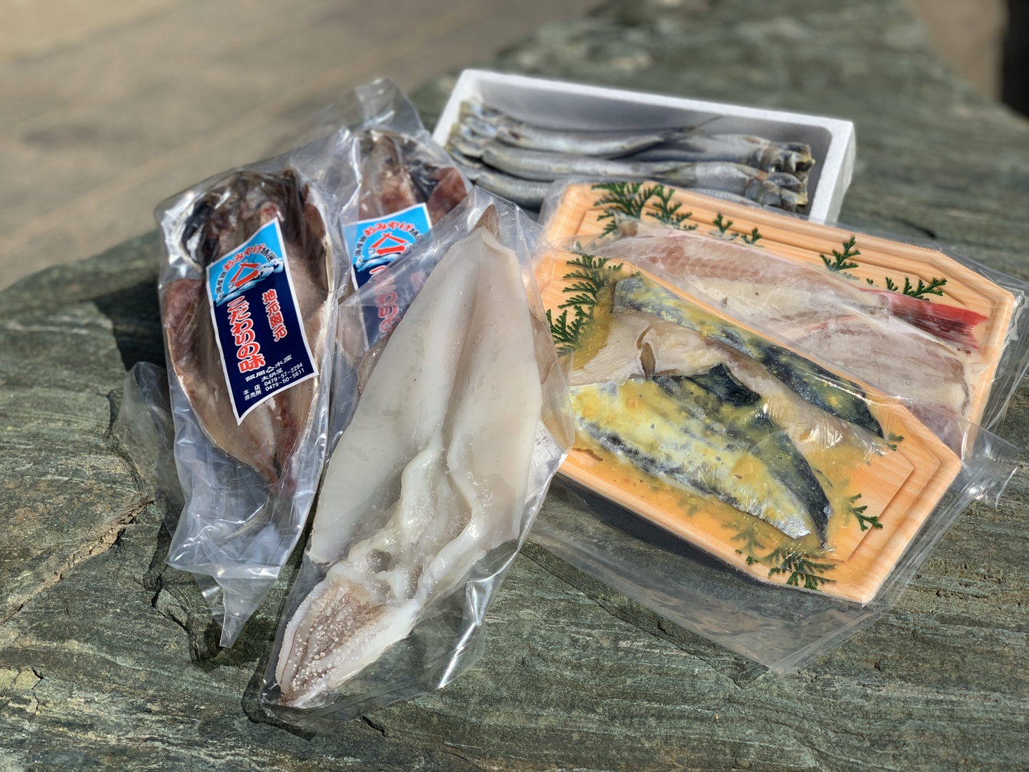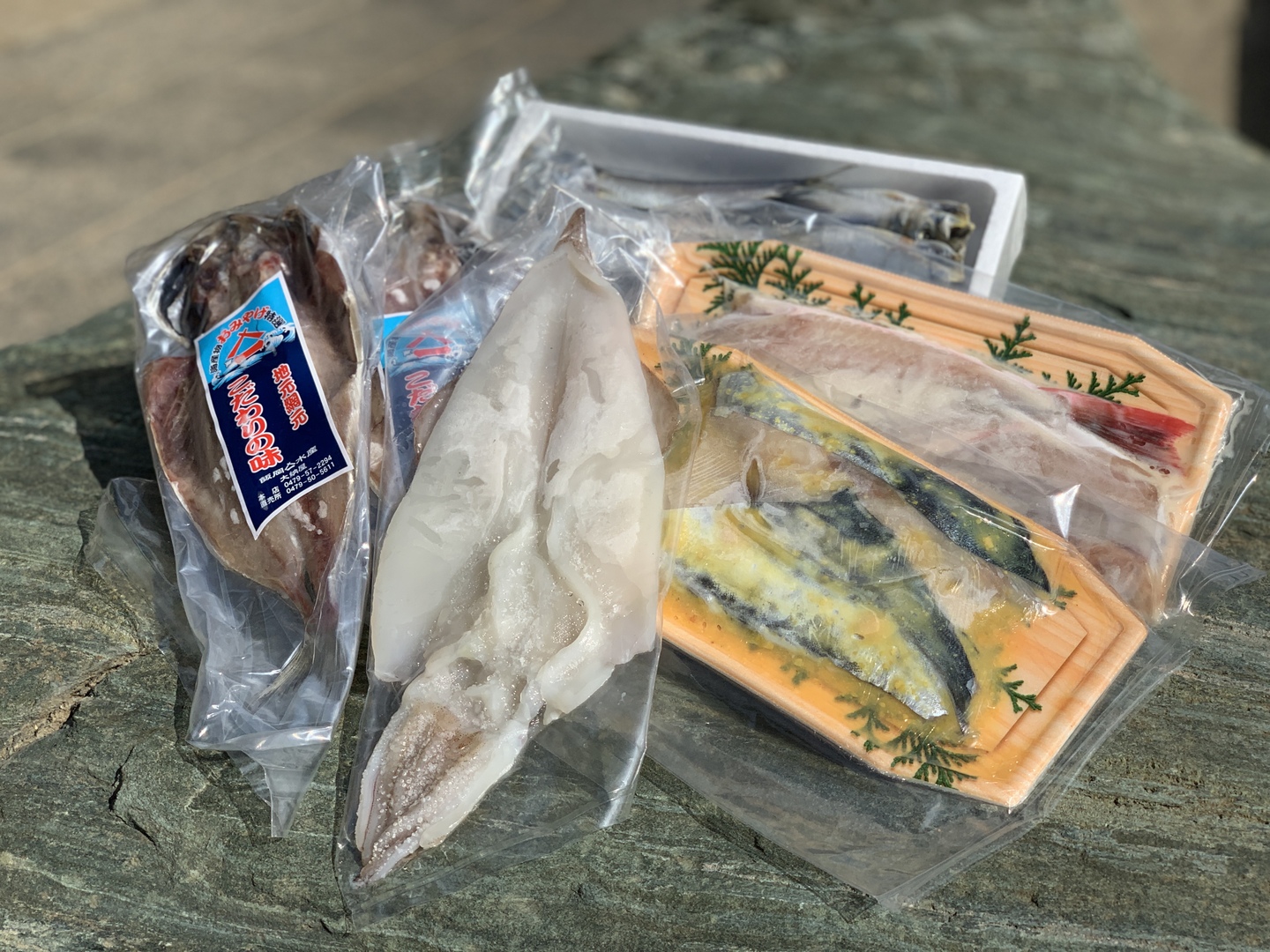 | 内容 | ヤリイカ一夜干し(約200g)国産、方々の粕漬け(約180g)国産、サワラの西京漬け2切れ(約100gx2)国産、真鰯丸干し(1Pあたり約300g)国産、アジの開き(約170gx2枚)国産 | ||||||