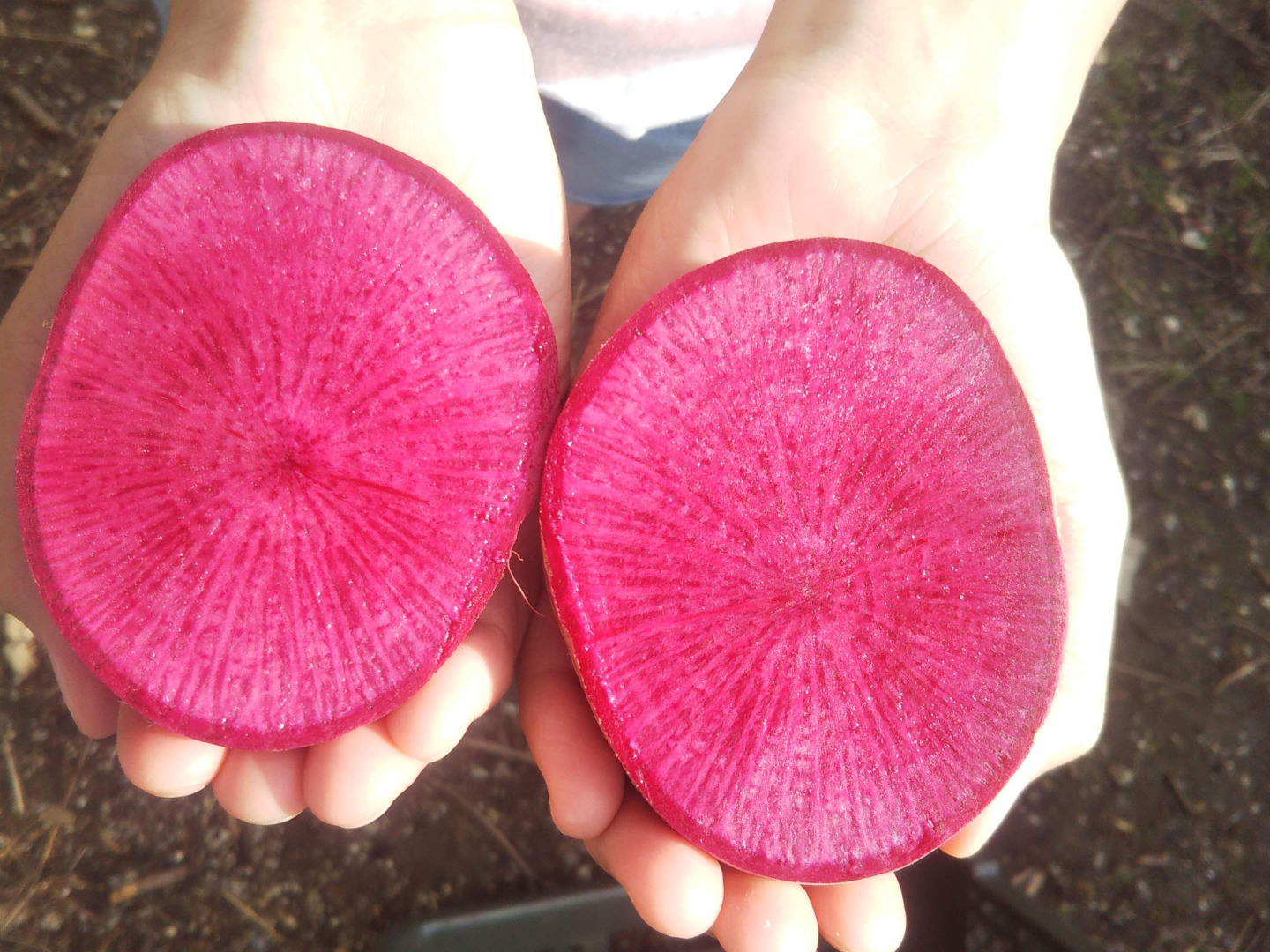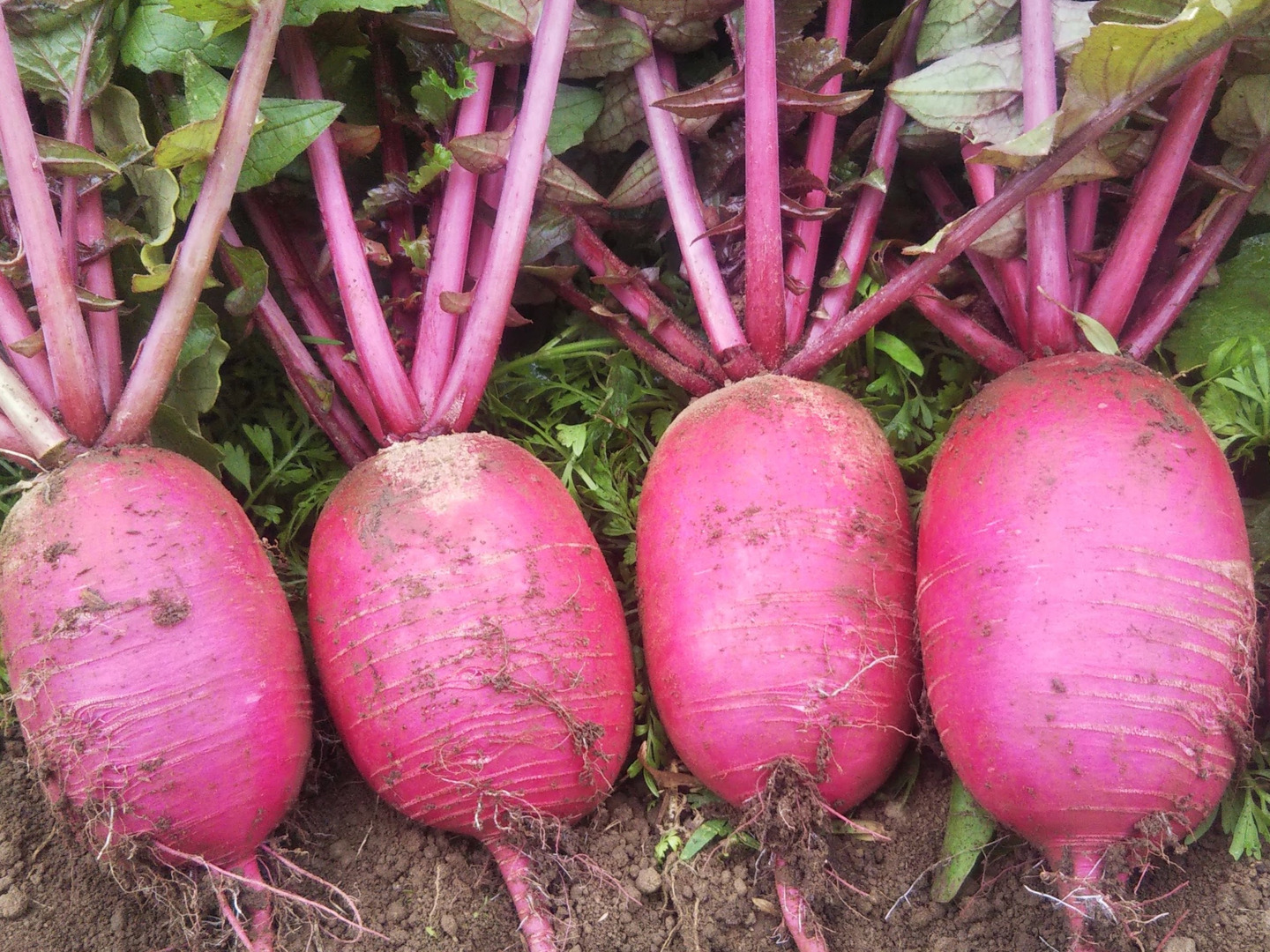 この紅くるり大根の赤色は、ポリフェノールの一種アントシアニンです。非常に強い抗酸化作用が期待される大根です。