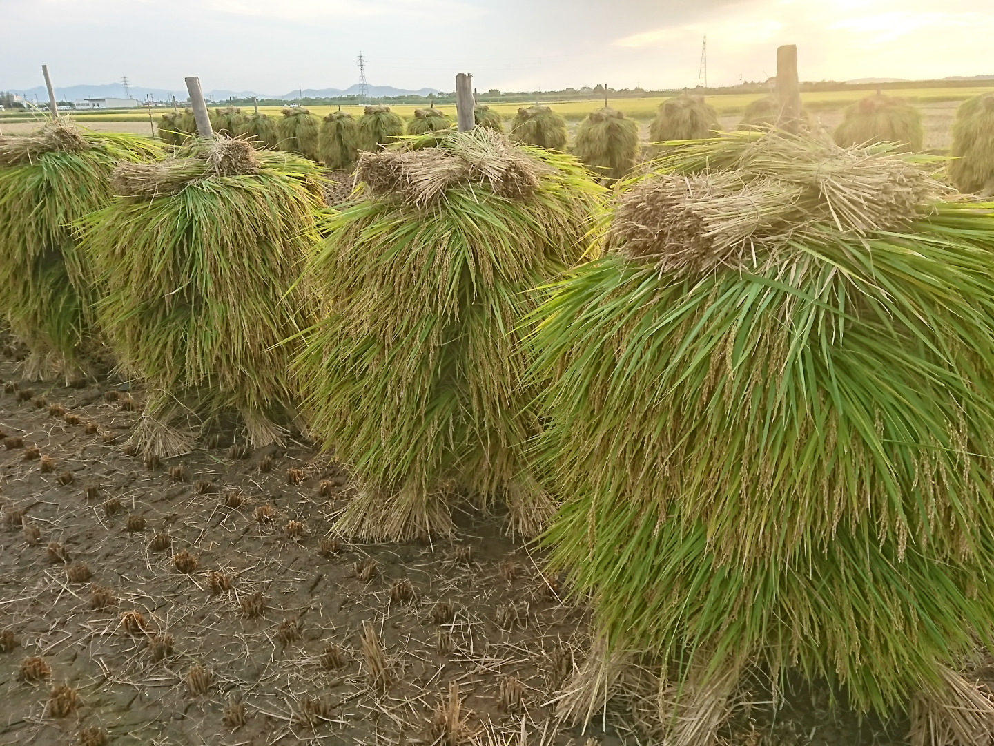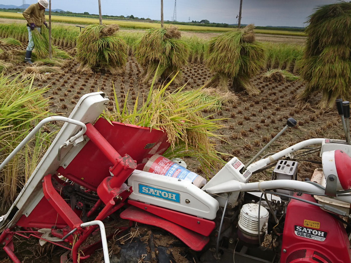 しかし、天日干しの場合は、刈取に4時間、そして、集めて杭にかける作業が1日半以上かかります。その後、2週間後に”杭”に掛かっている稲を入れ替え(稲の穂の部分を今度は中に入れて、逆を乾かす)に1日以上。その2週間後に杭から外し、脱穀作業、藁を散布及び結束作業に1日半以上かかります。そして、自然乾燥ため、天候に左右され、雨が続いたりする場合は、乾燥調製期間が延びたりします。