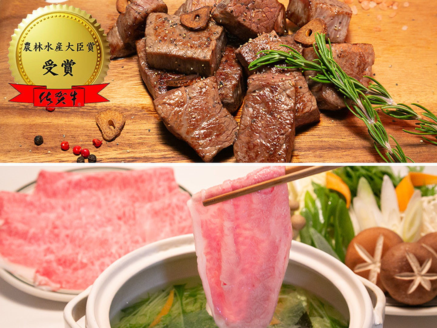 農林水産大臣賞を2度受賞した田中畜産が自信を持ってお届けする、佐賀牛「たなか和牛」のヒレサイコロ/サーロインしゃぶしゃぶの欲張りセットです。