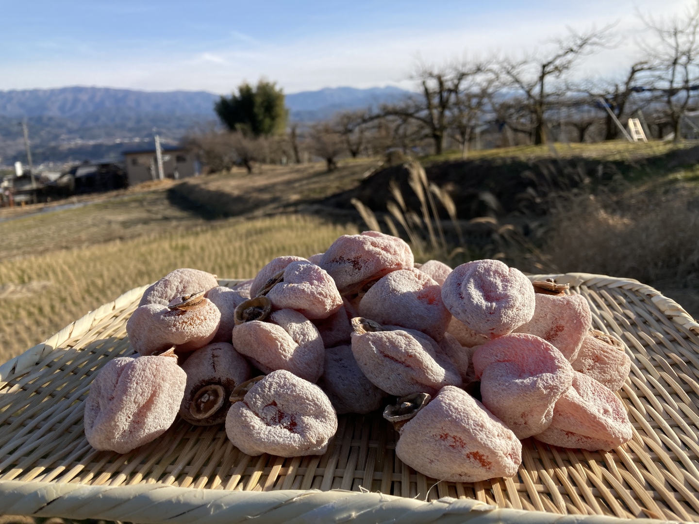 最終的に果実から出た果汁のブドウ糖が表面を覆い白くお化粧をしたような状態になります。これこそが市田柿の特徴です。
