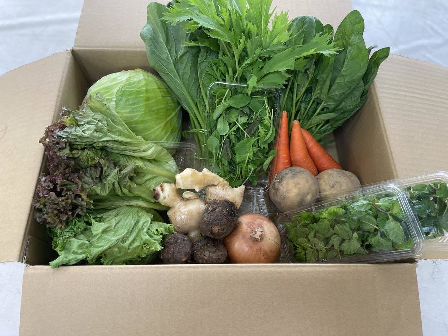 有機栽培で育った旬のお野菜8品目 ベビーリーフ ・ほうれん草 ・小松菜 ・水菜や ミニ白菜、リーフレタス、サニーレタス、ミニ大根、 人参 ・玉ねぎ ・ジャガイモ ・さつまいもなどのお野菜と ミント、ローズマリー、ミントなどハーブの中から8品目をお届けします