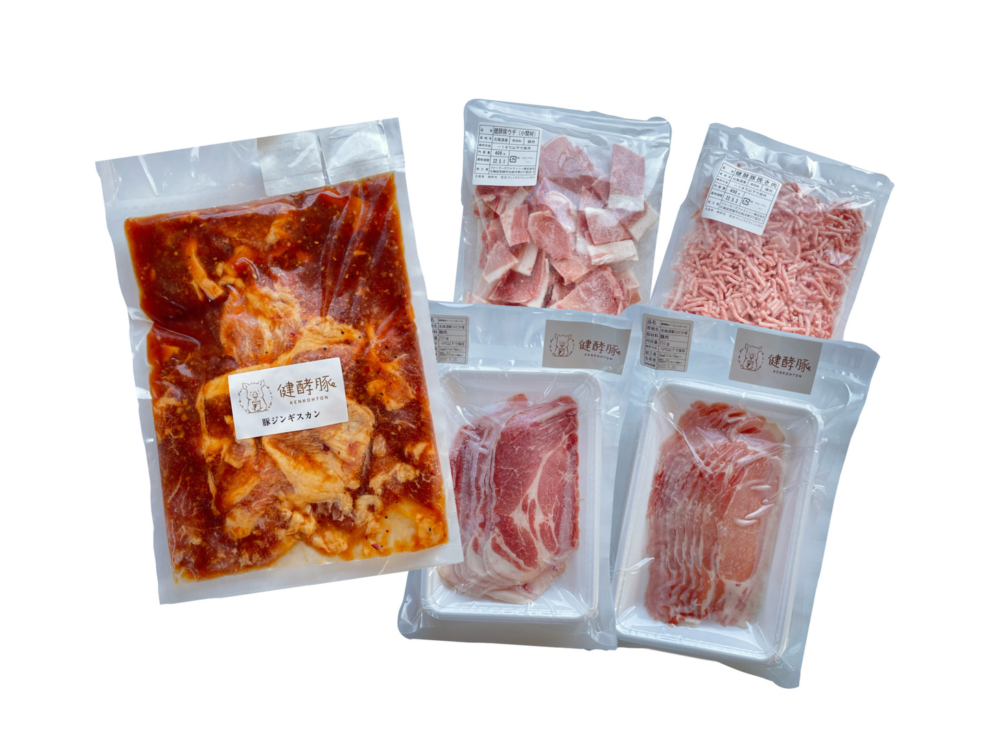 健酵豚とは、約50種の野菜や果物から抽出した酵素エキスを飲ませて育てた豚になります。そのほかにも、ワラや牧草などの繊維質を多く与え、腸を強くするため、薬に頼らず育てることができます。