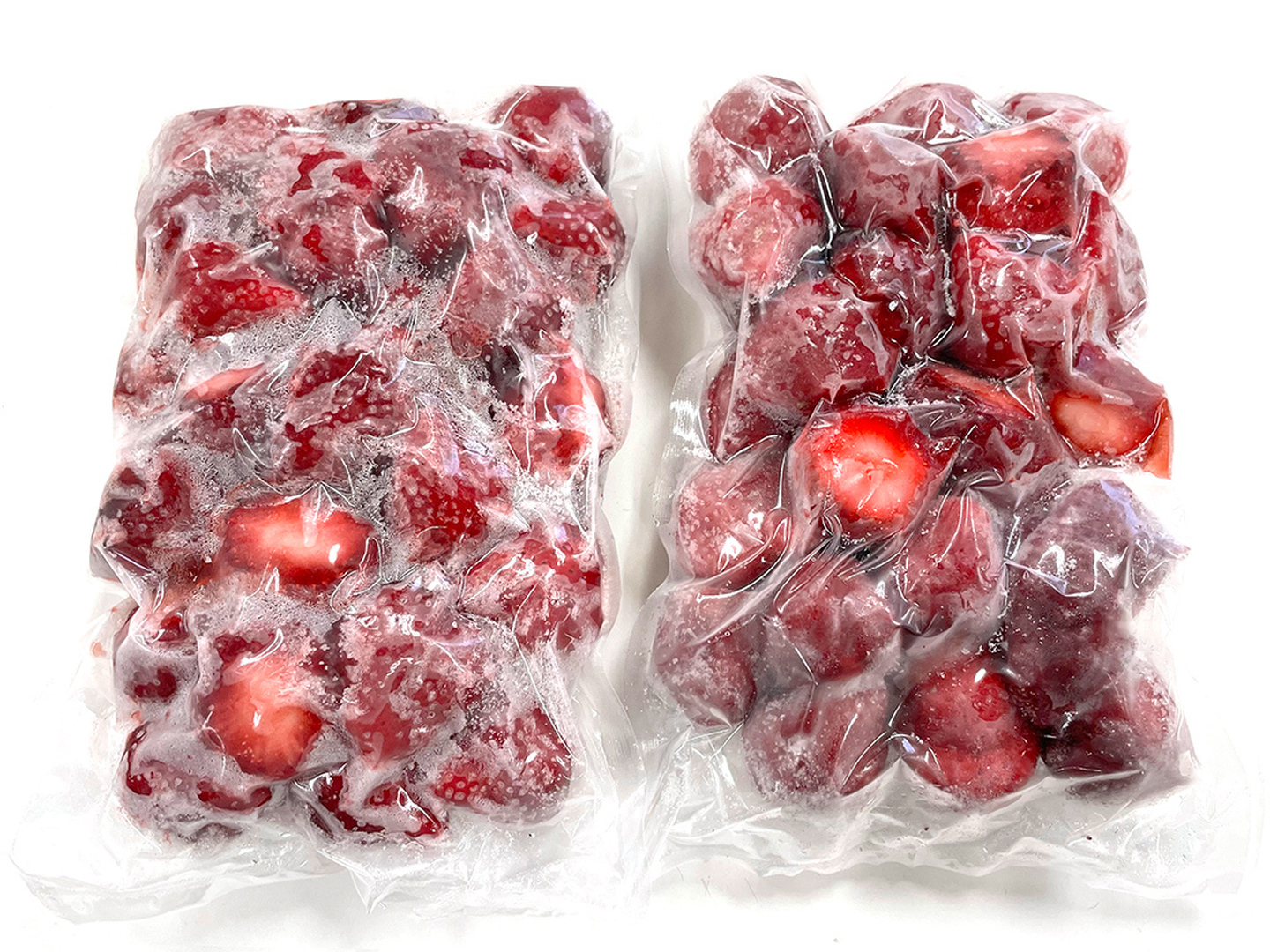 ・生のいちごを真空パック機で真空にする際に圧力がかかり、一部いちごが潰れたり、果汁が出るためシャーベット状になっている部分もあります。